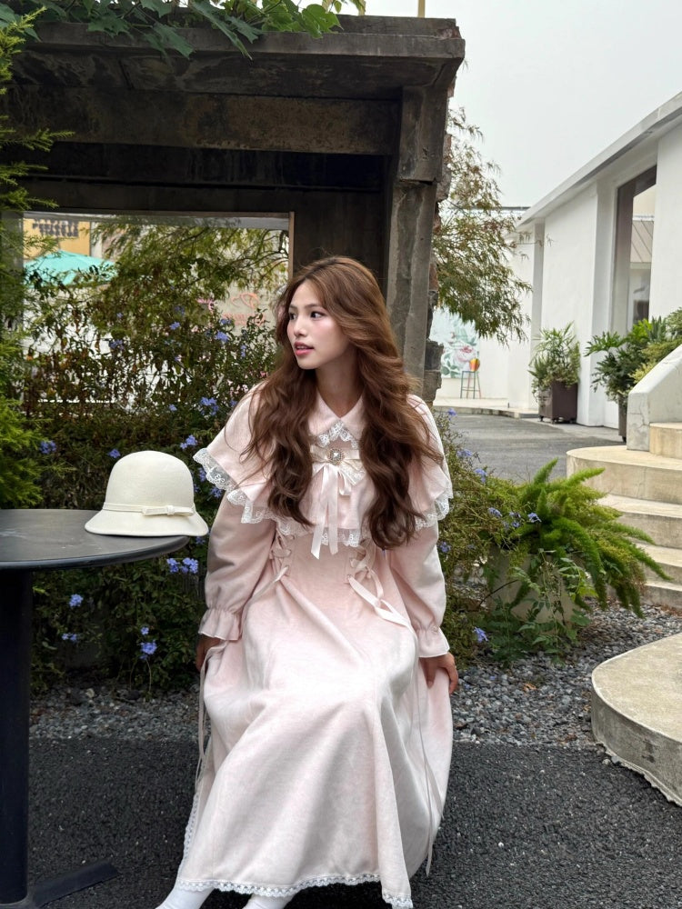Bling 2-Piece Set A-Line Lace Trim Maxi Dresses Sweet Lapel Bow Long Sleeve Lace-Up Long Dress AP3983