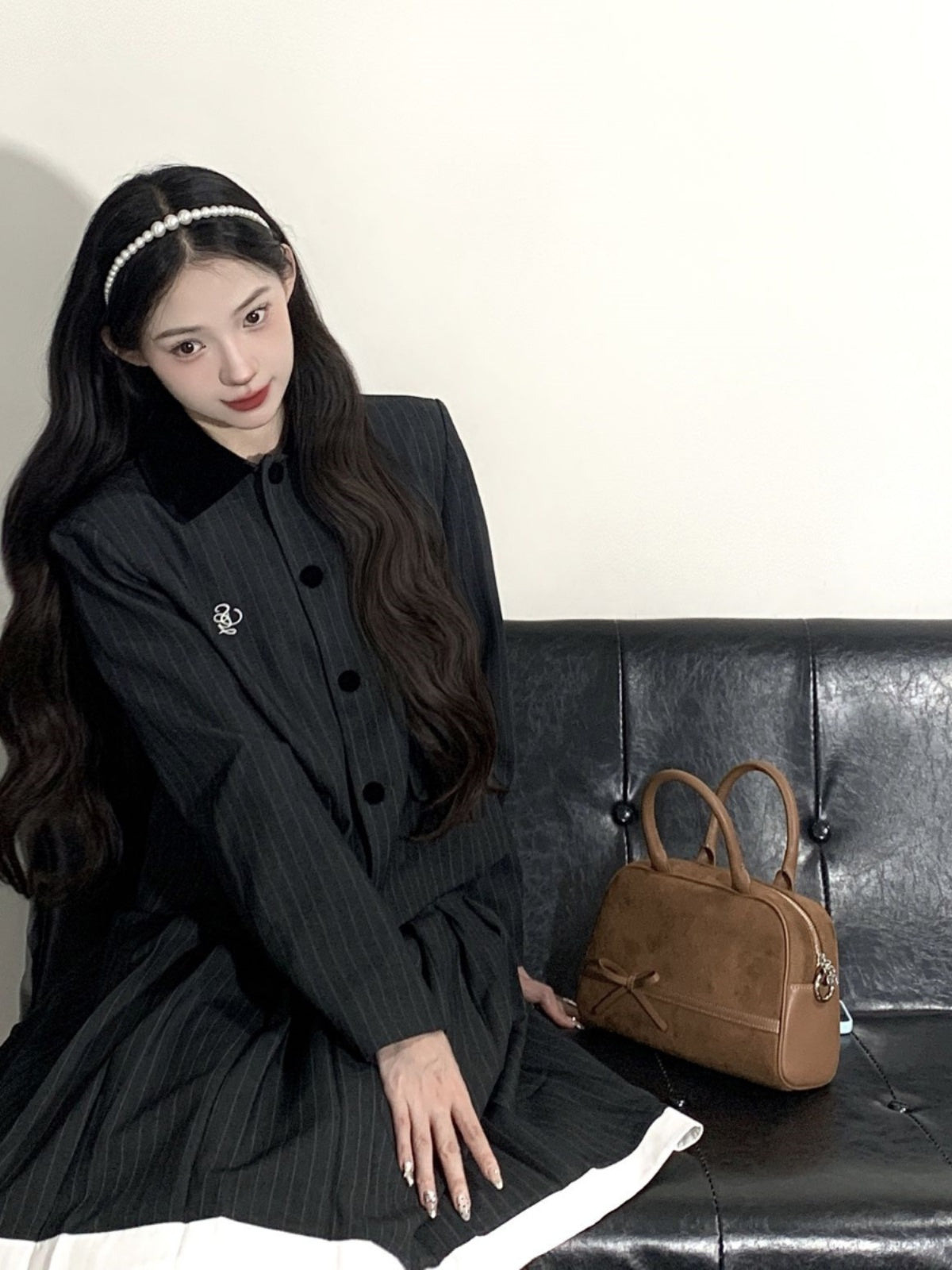 Amazing 2-Piece Set Long Sleeve Midi Dresses Simple Lapel Neck A-Line Stripe Long Dress AP4080