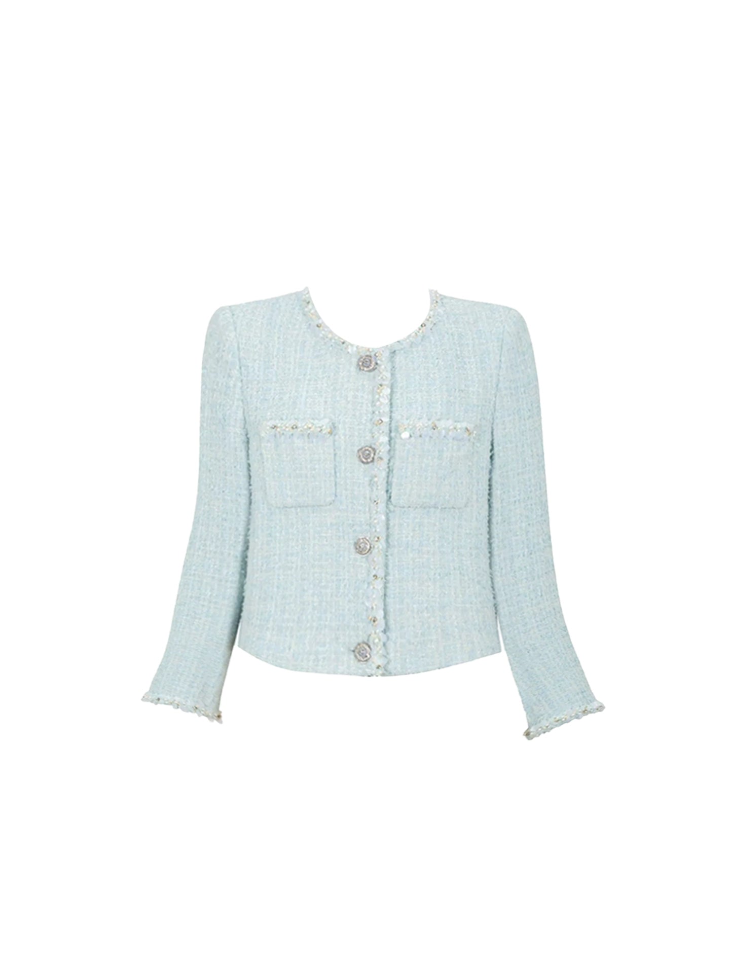 Minimalist Tweed 2-Piece Set Jewel Neck Beaded Mini Skirt Graceful Long Sleeve A-Line Pleated Short Dress AP4181
