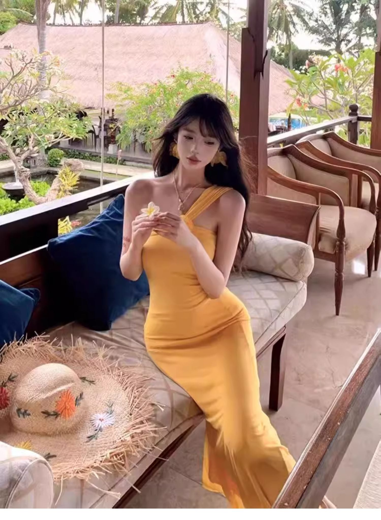 Summer New Stylish Flower Shape Ornament Sheath Elegant One Shoulder Strap Long Dress AP0300