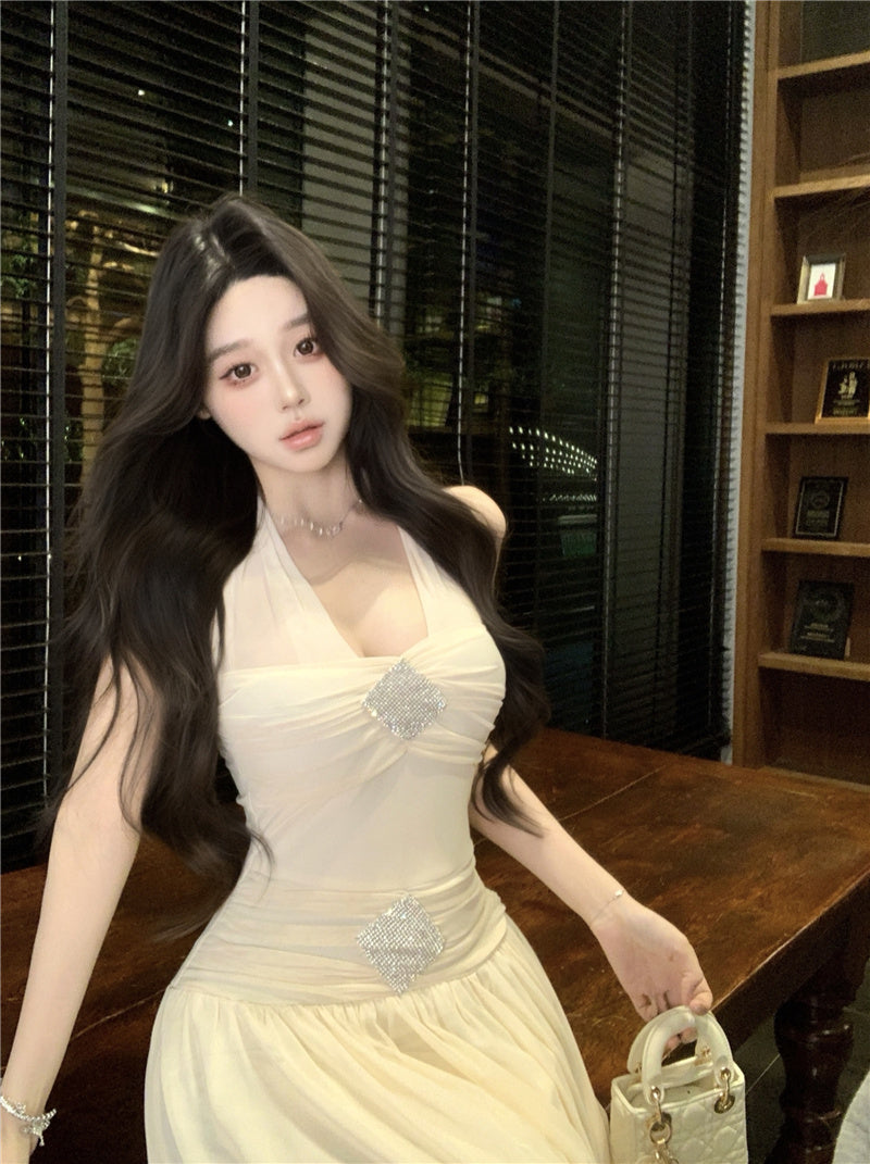 Graceful Rhinestone Design Cinched-Waist Maxi Dress French Style Feast Outfit Tulle OverlayFlowy Hem Halter Dress AP1902