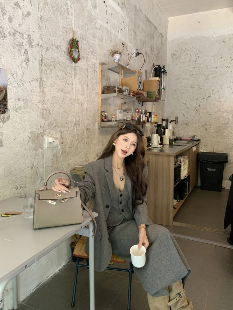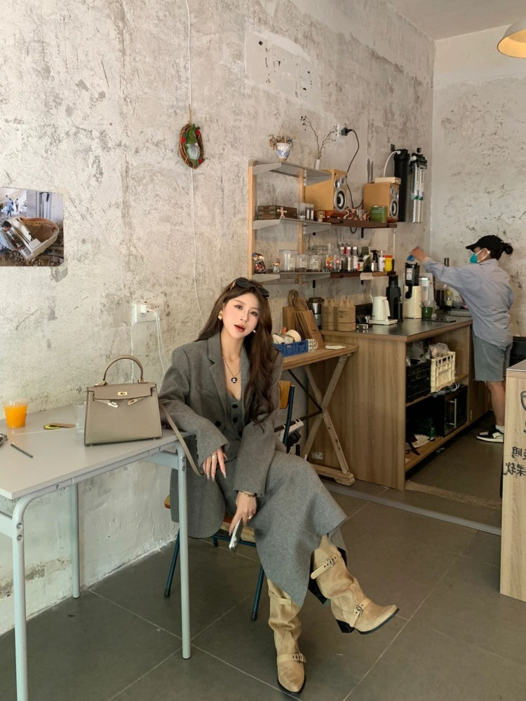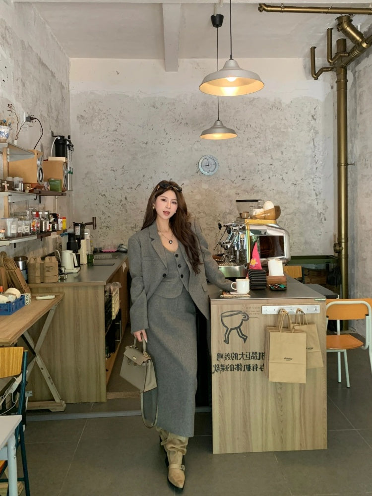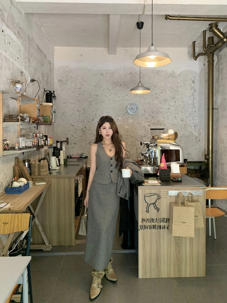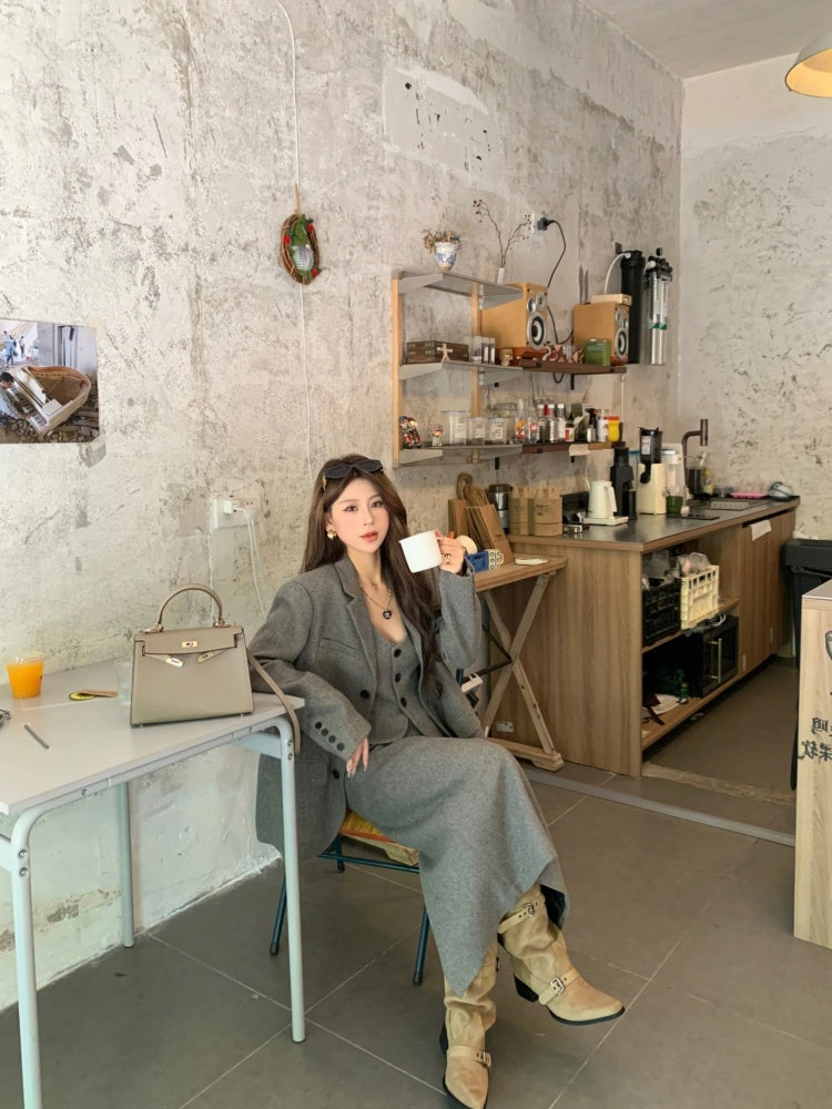 Superb Long Sleeve 3-Piece Set Maxi Dresses With Cardigan Charming V Neck Office Outfit A-Line Long Dress AP4012