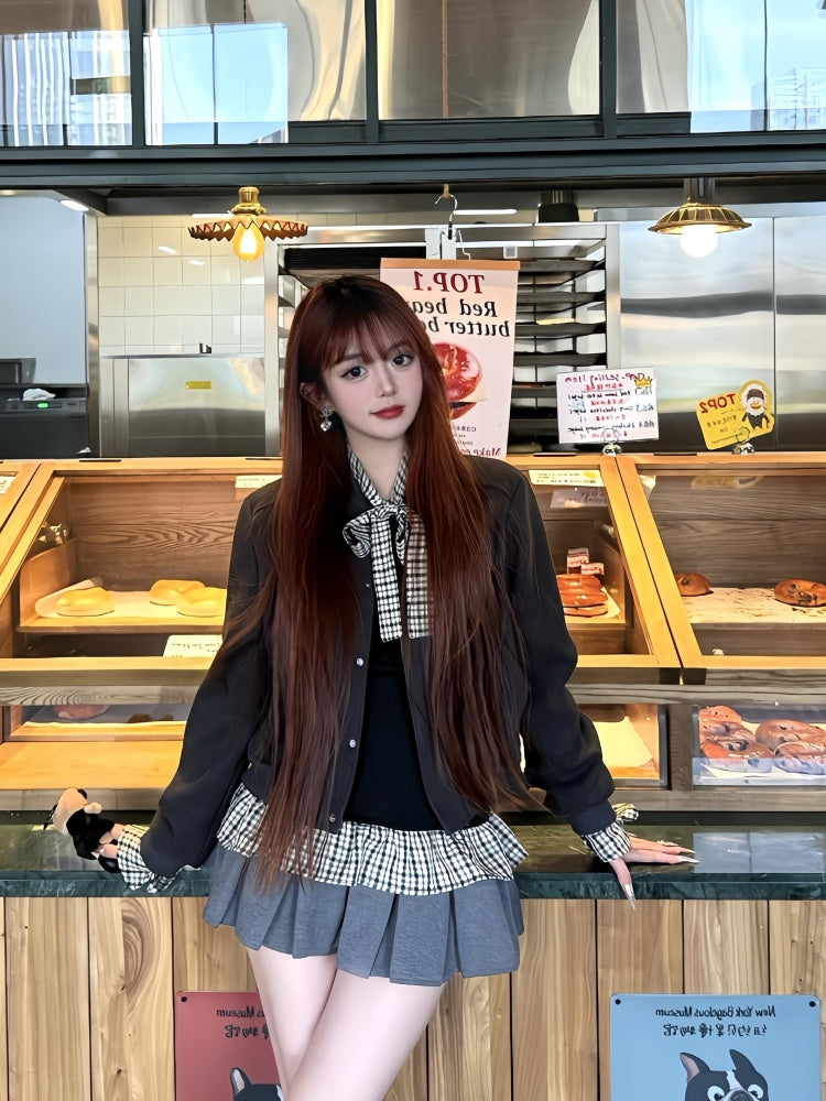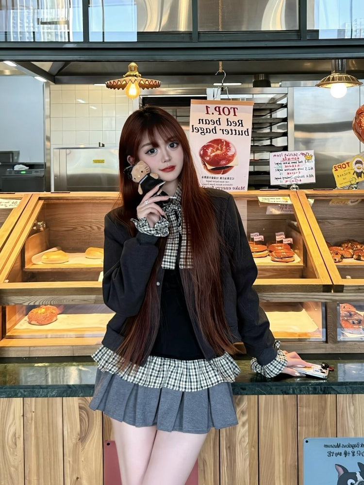 Everyday Wear Jewel Neck 3-Piece Set Mini Skirt Chic Plaid Ruffles Hem Long Sleeve A-Line Short Dress AP4071