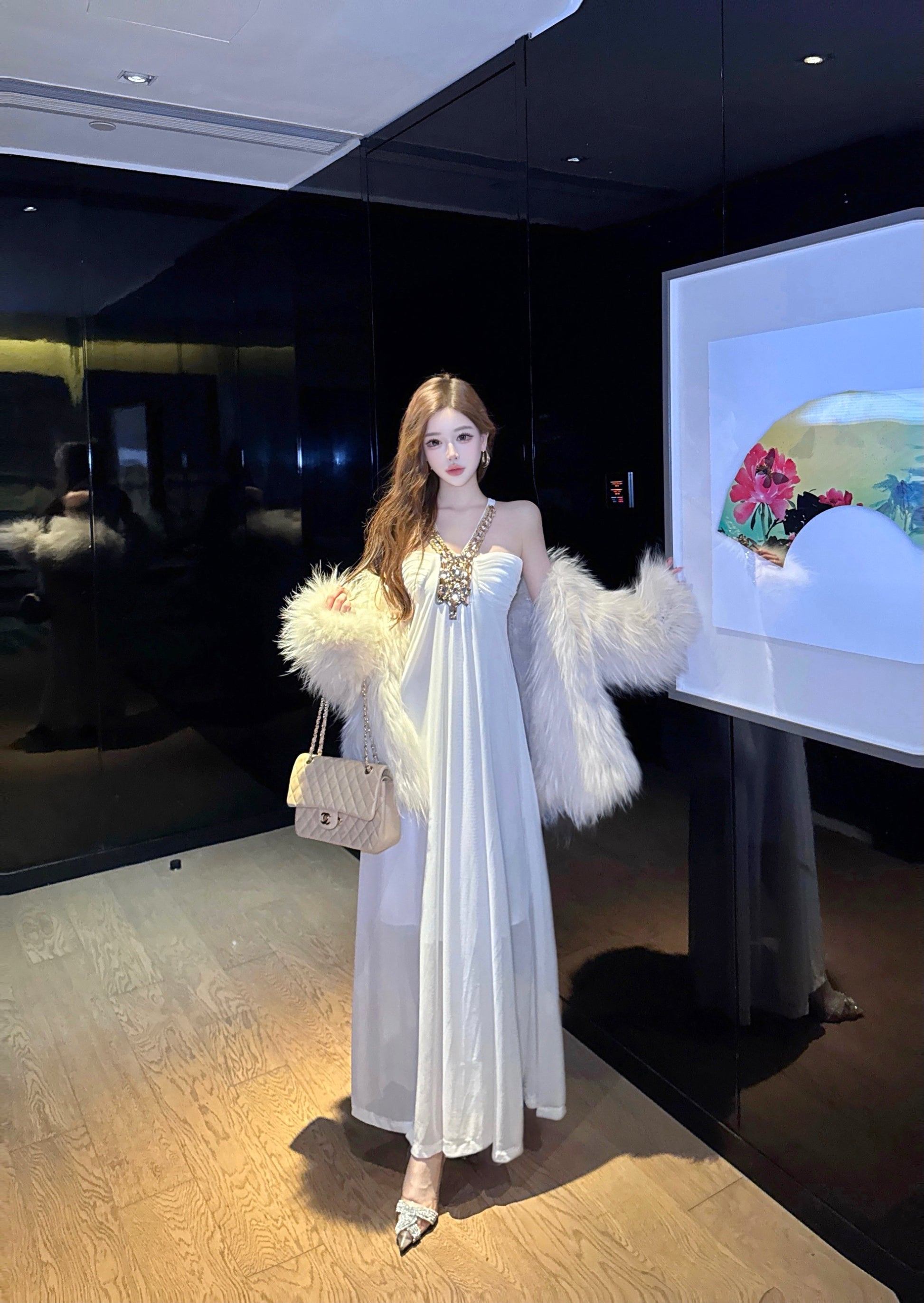Fascinating A-Line White Evening Maxi Dress Graceful Crystals Accent Halter Long Dress AP3746