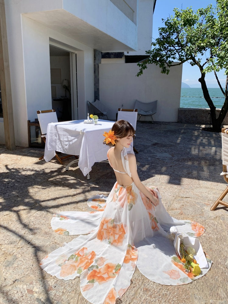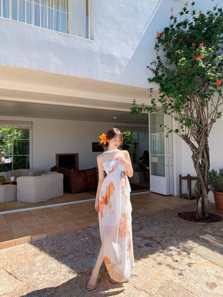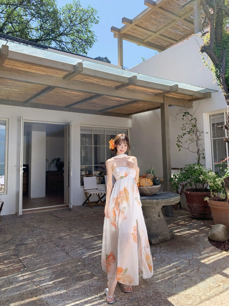 Graceful A-Line Halter Neck Slit Maxi Dress With Lining Princess Asymmetric Hem Floral Print Long Dress AP3340