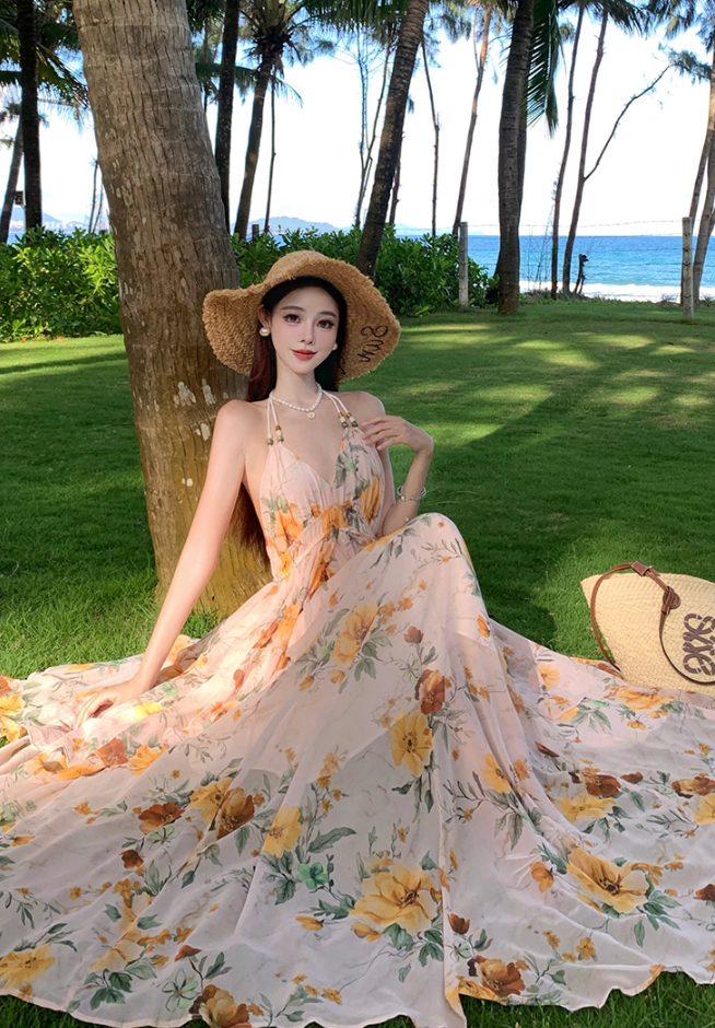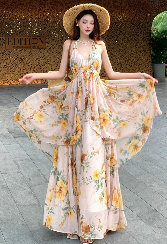 Alluring A-Line Halter Neck Tie-Back Maxi Dress Flowy Floral Print Backless Layered Long Dress AP3363
