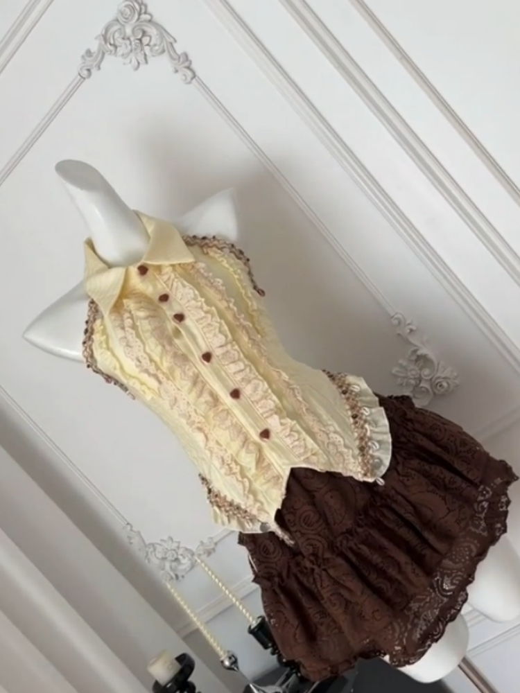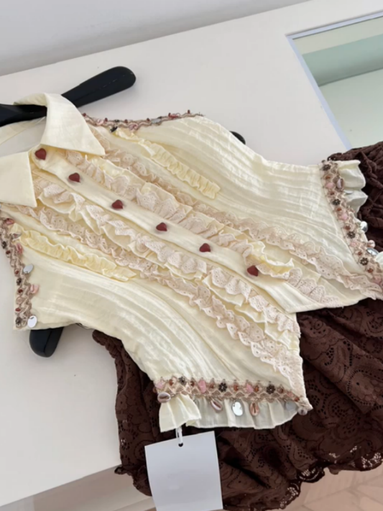 Ethereal A-Line 2-Piece Set Lapel Neck Mini Skirt Adorable Lace Trim Ruffles Tiered Short Dress AP4034