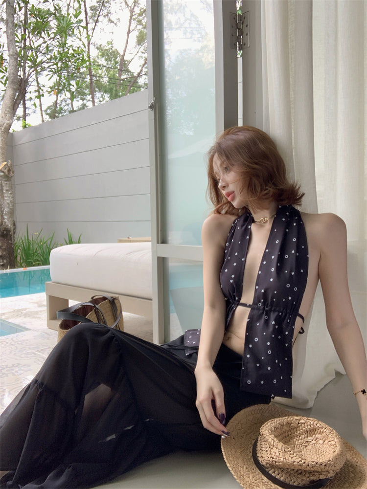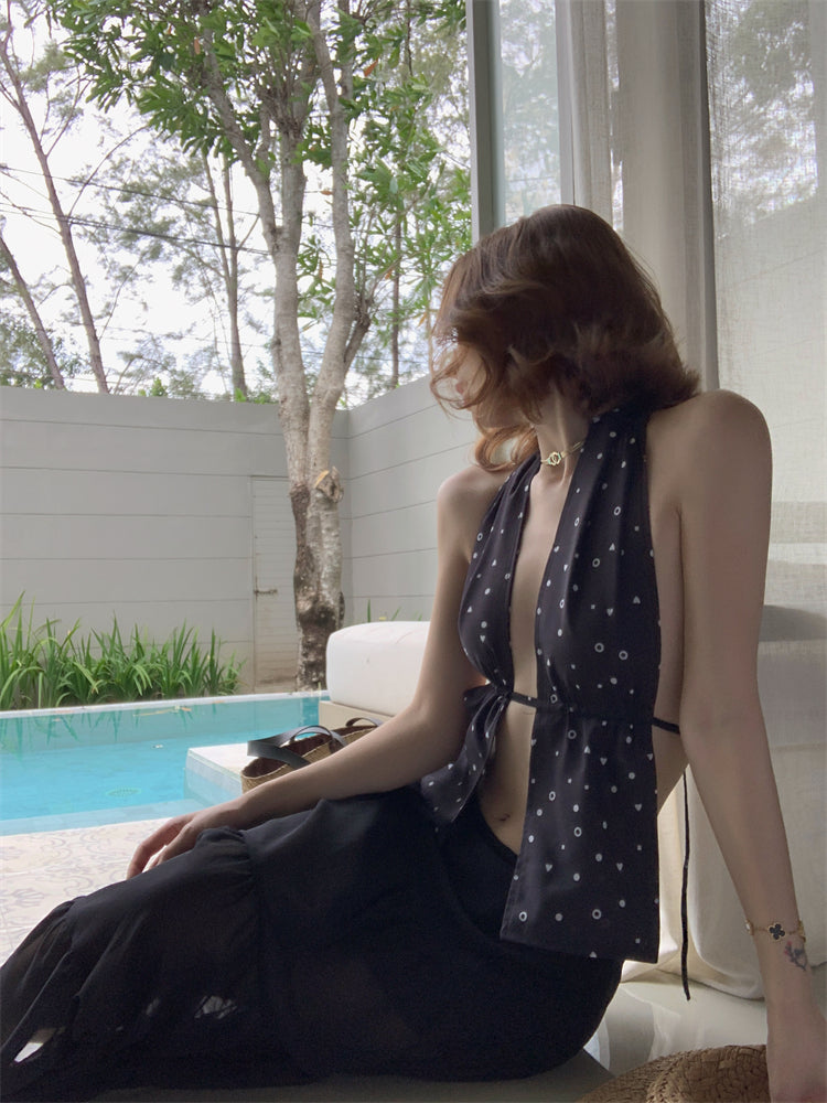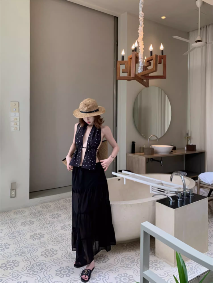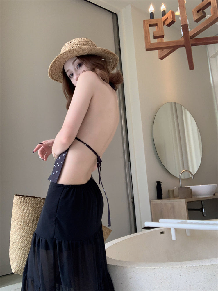 Vintage A-Line Polka Dots Maxi Dress Boho-Style Cinched-Waist Flowy Tulle Skirt Backless Halter Long Dress AP3447