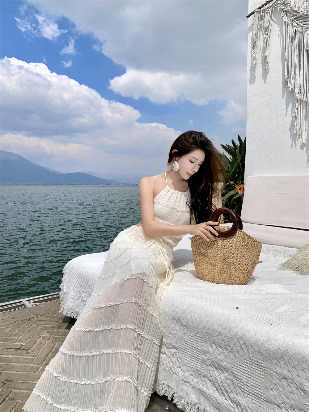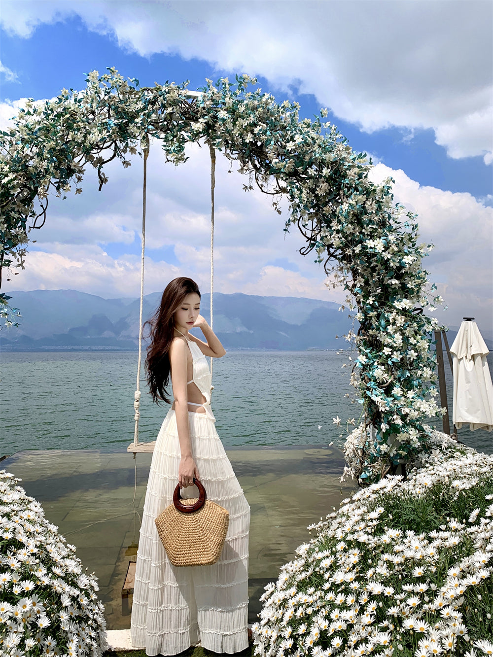 Glamorous A-Line 2-Piece Set Maxi Dress Casual Tie-Back Pleated Flowy White Halter Long Dress AP3509