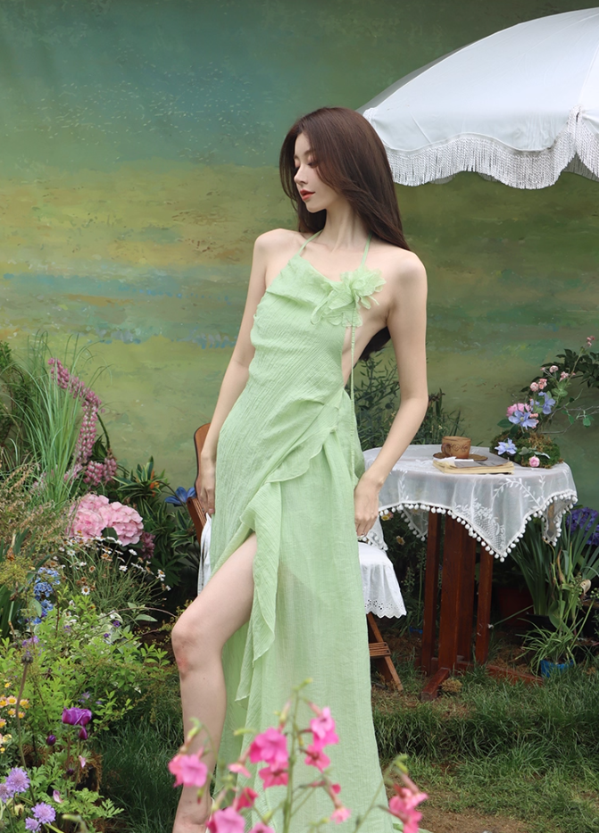 Vintage A-Line High-Slit Ruffles Trim Maxi Dress Dreamy 3D Floral Accent Backless Halter Long Dress AP3517