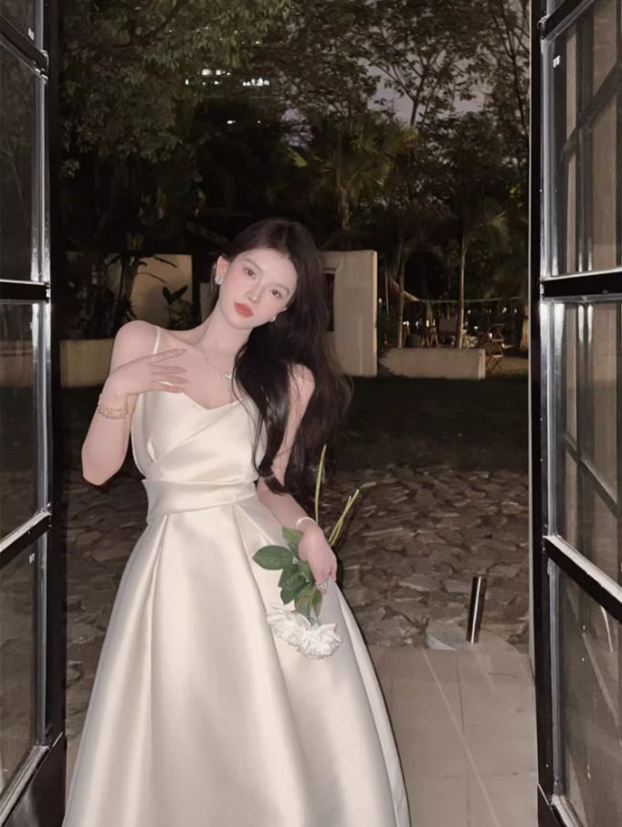 Romantic A-Line Spaghetti Straps White Maxi Dress Elegant Satin Sheen Cinched-Waist Long Dress AP3597
