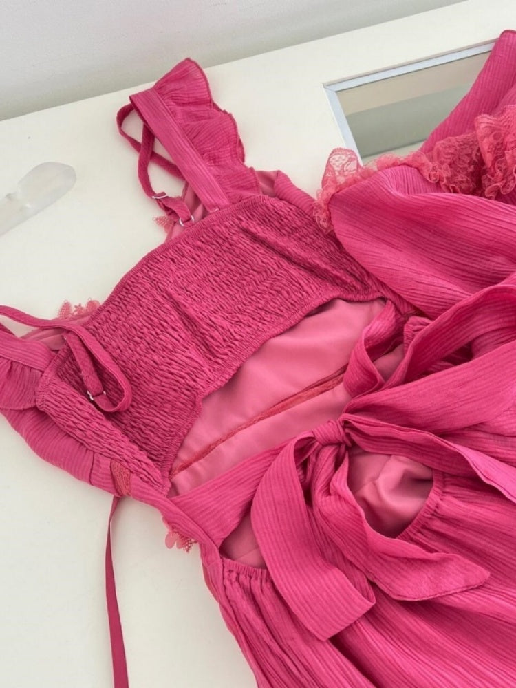 Chic A-Line Lace Trim Tiered Maxi Dress Romantic Beaded Floral Design Spaghetti Straps Ruffles Long Dress AP4022