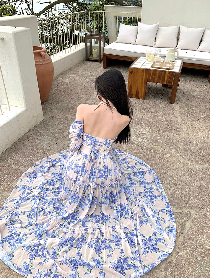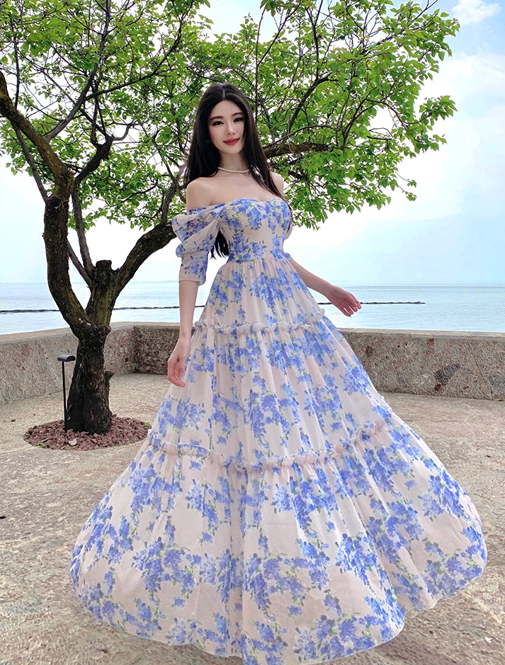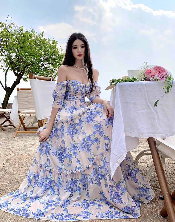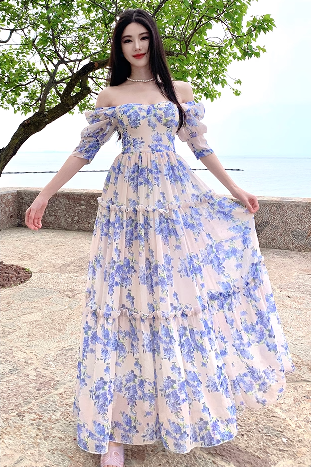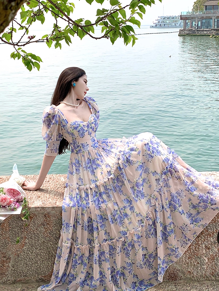 Casual A-Line Square Neck Maxi Dresses Princess Short Sleeve Floral Print Ruffles Flowy Long Dress AP3383