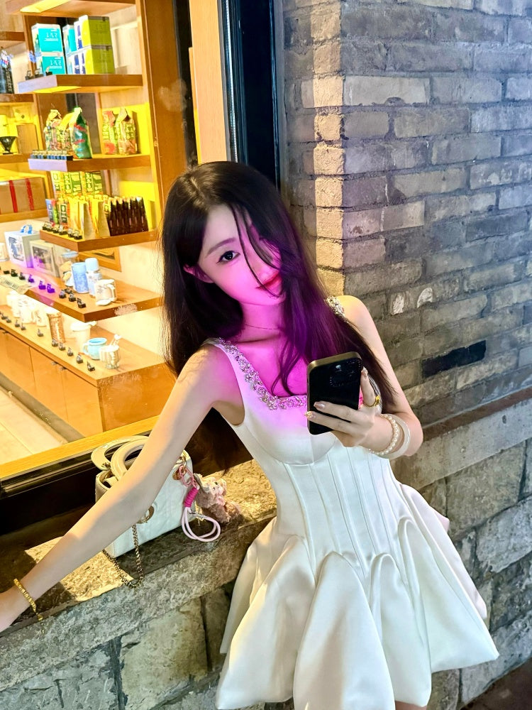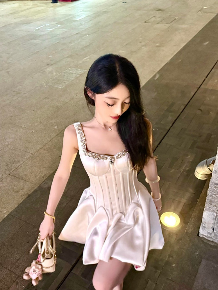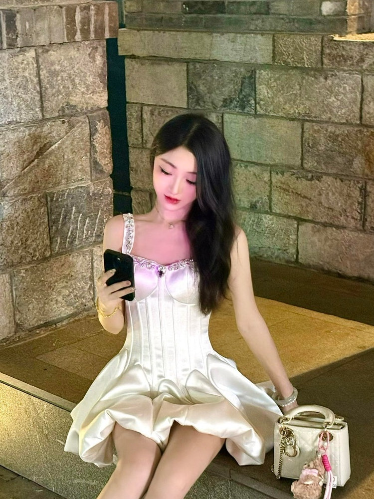 Hot Girls A-Line Beaded Cinched-Waist Mini Skirt Glittering White Satin Spaghetti Strap Short Dress AP3998