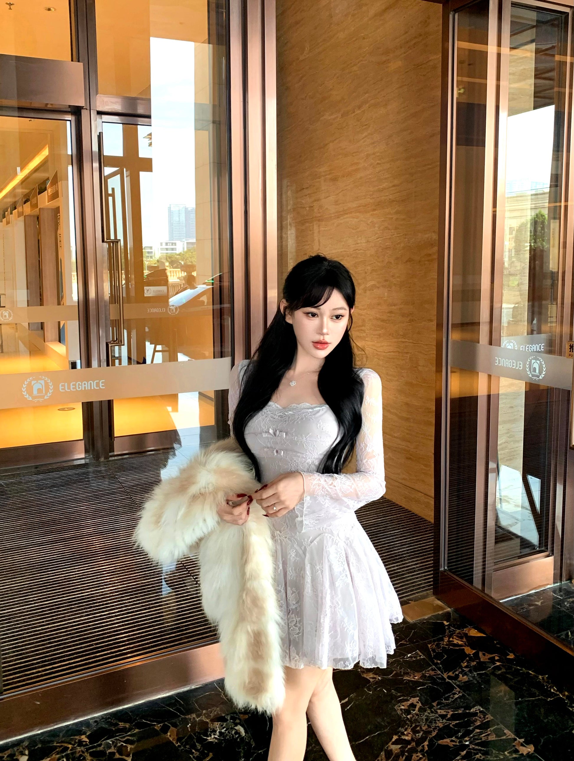Classical Sheer Lace Splicing A-Line Mini Skirt Romantic Square Neck Bows Long Sleeve Short Dress AP3757