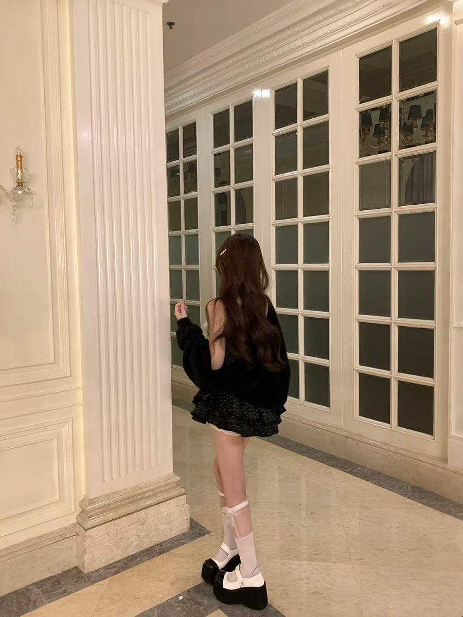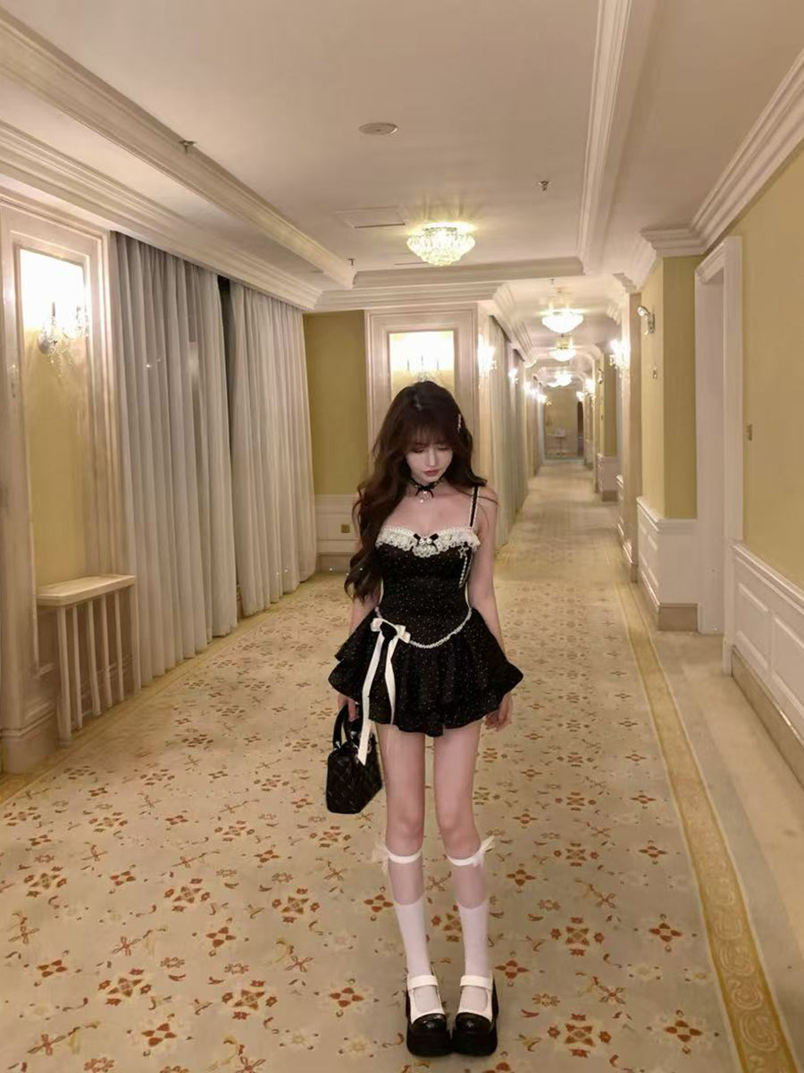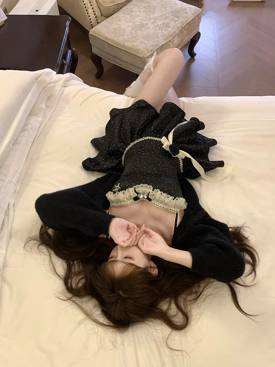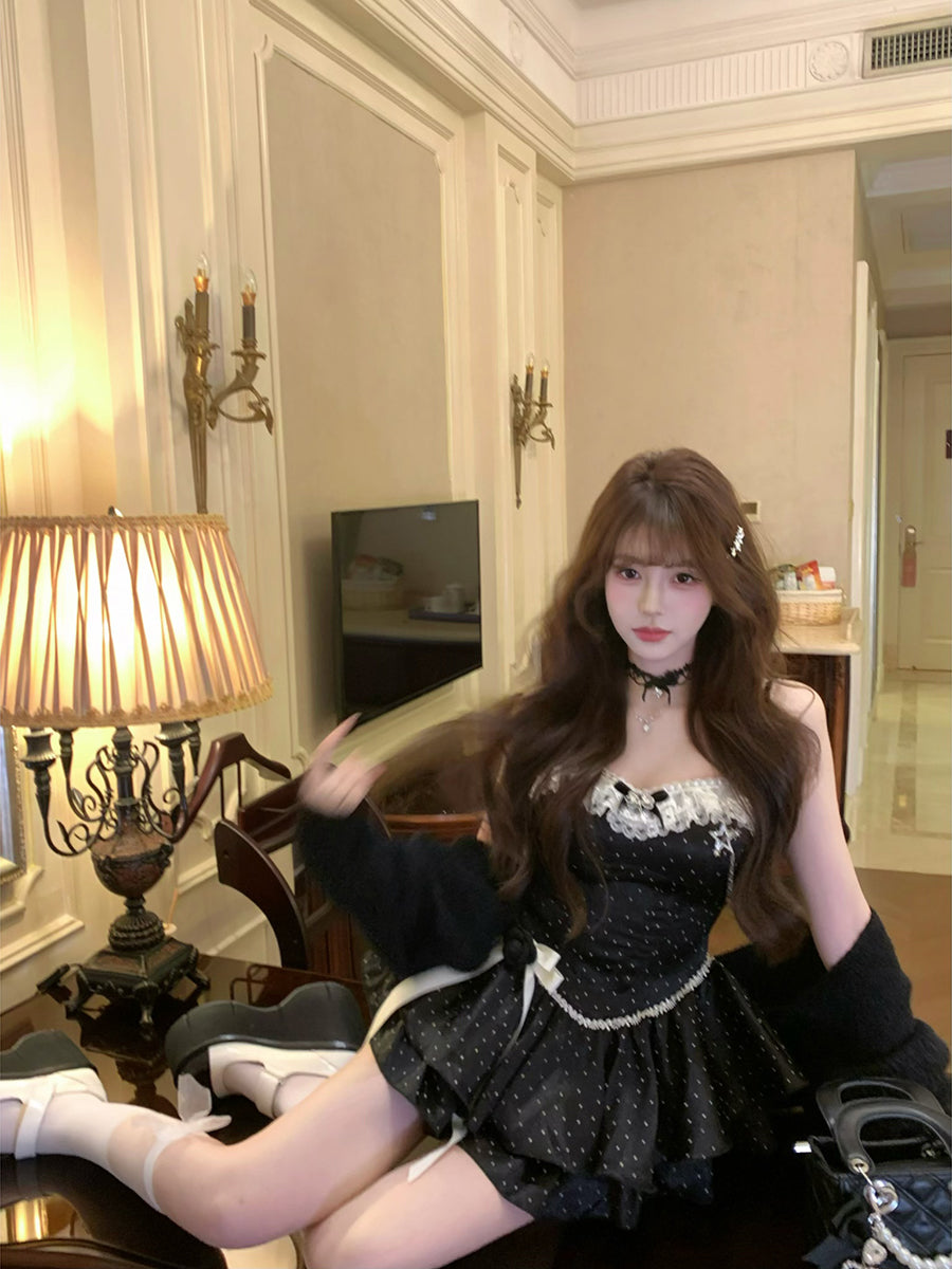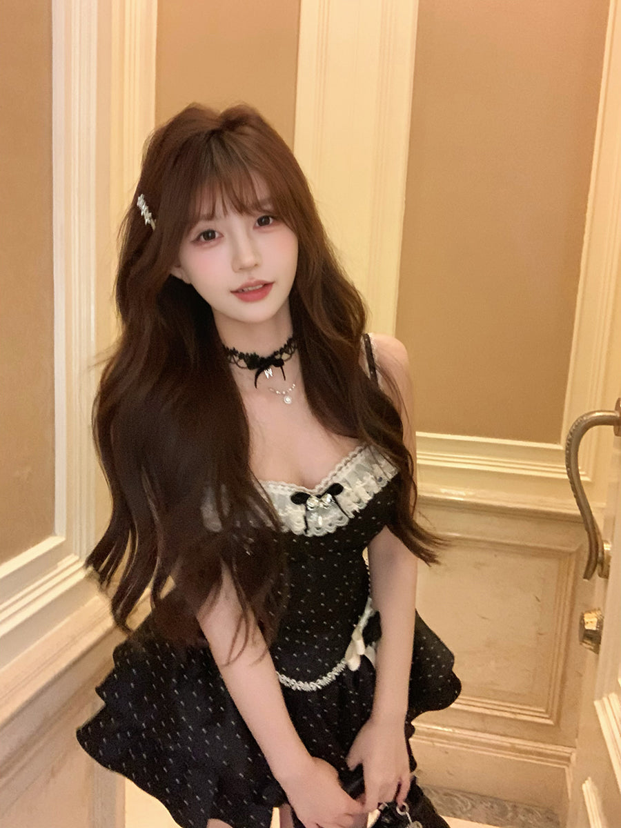 Modern Polka Dots A-Line Party Outfit Tiered Mini Skirt Playful Lace Bows Spaghetti Strap Short Dress AP3788
