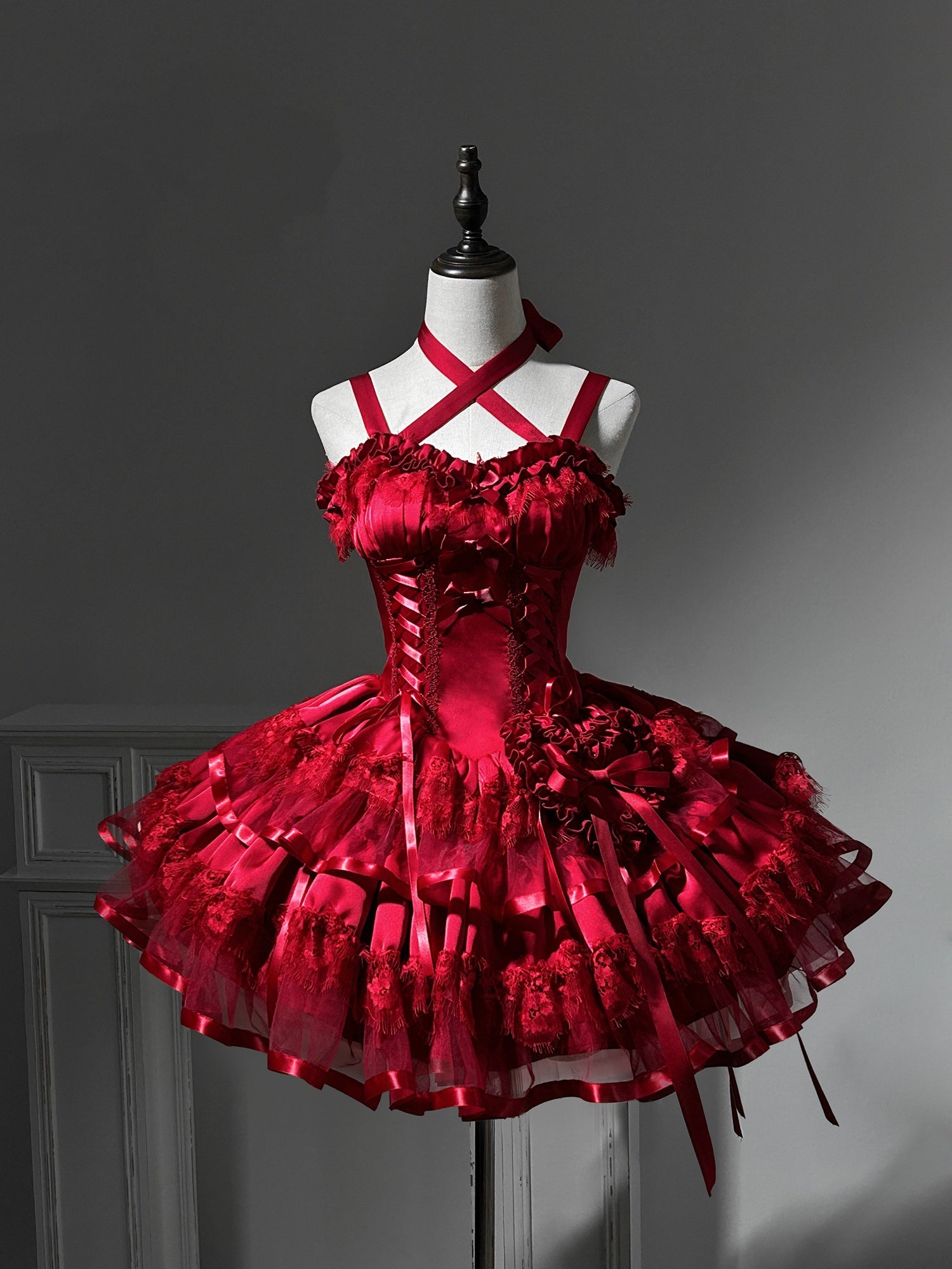 Glamorous A-Line Spaghetti Straps Ruffled Birthday Dress Bows Lace Tiered Red Homecoming Dress AP3265
