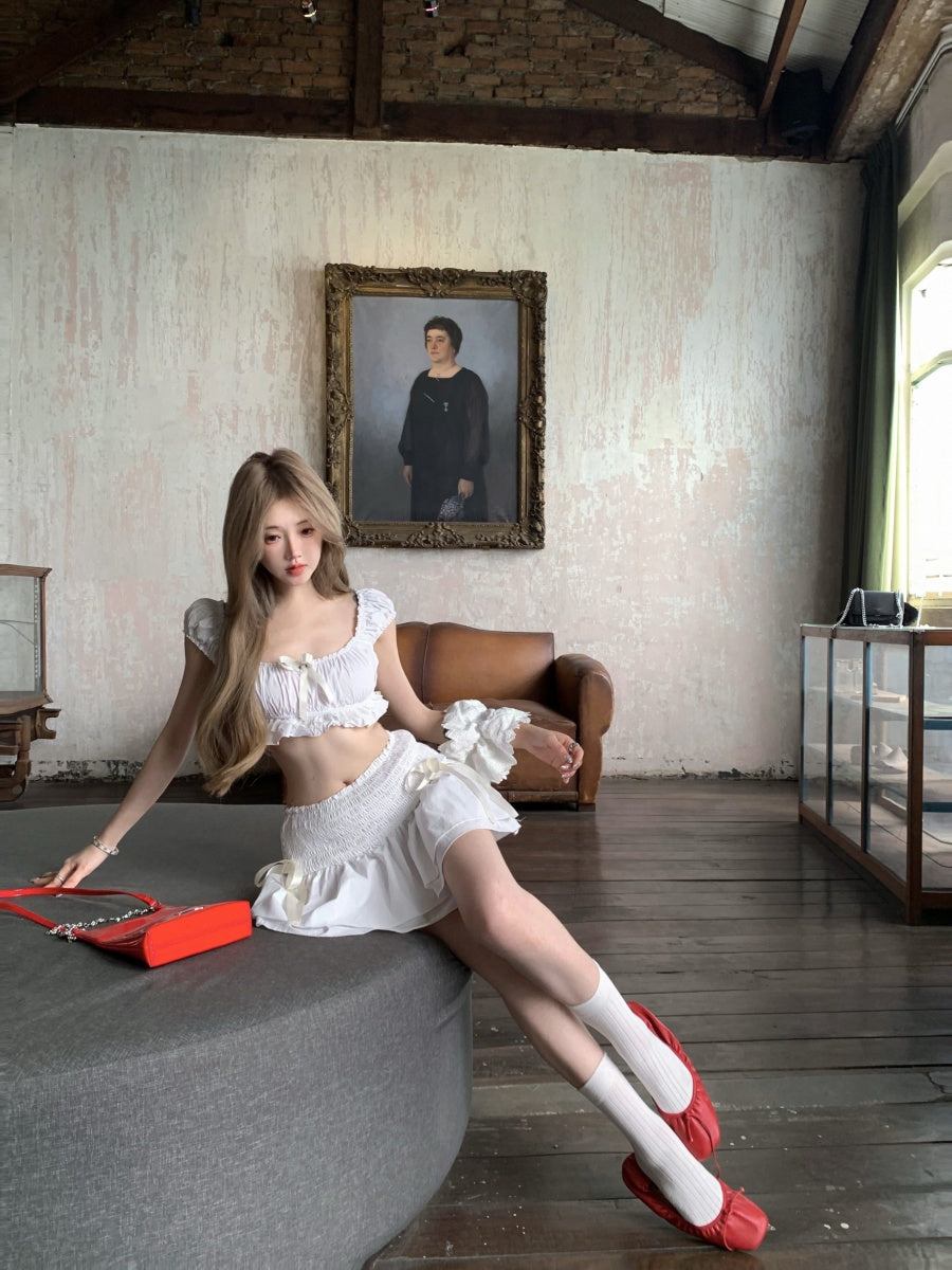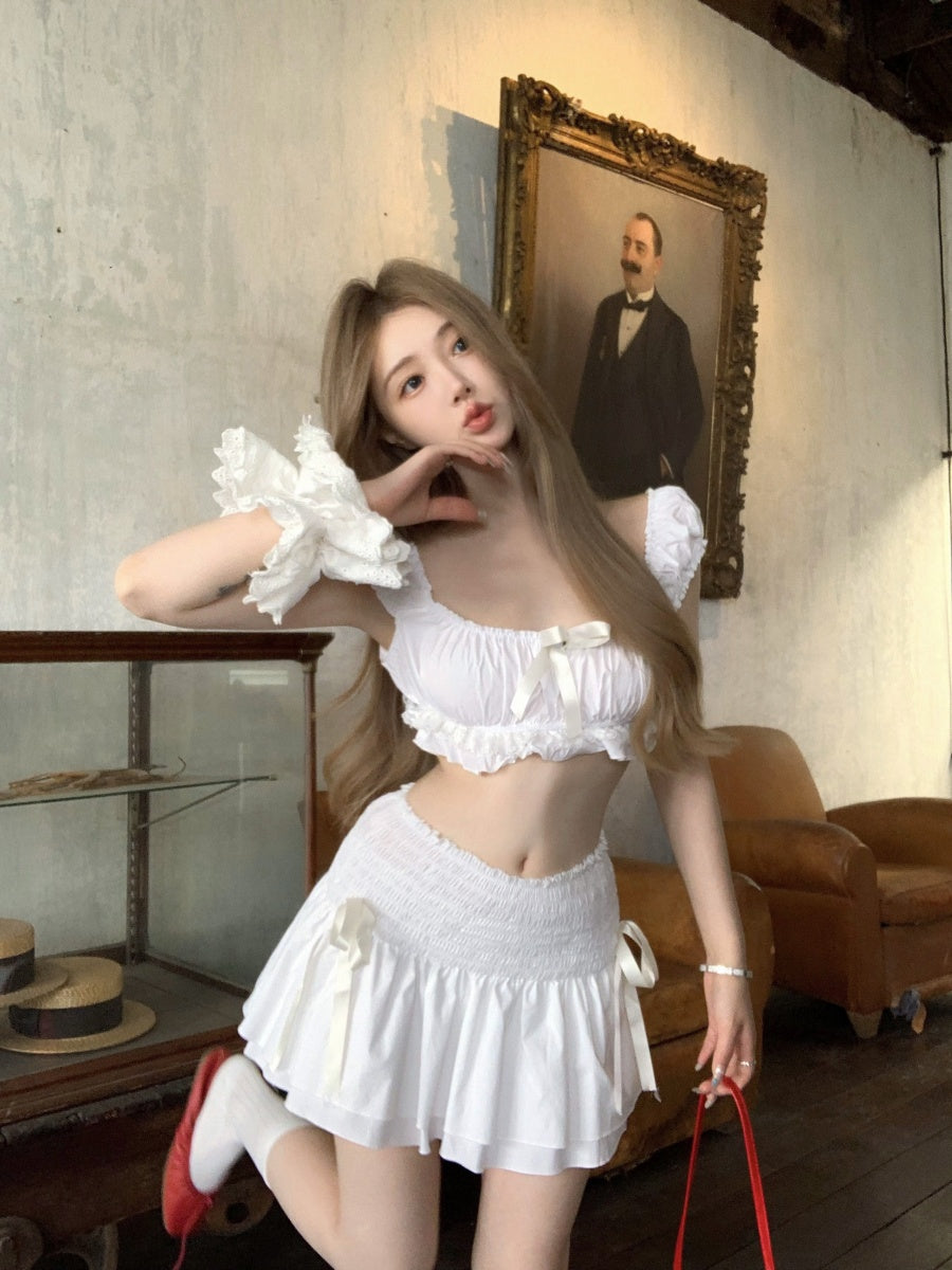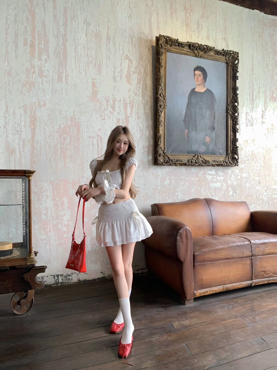 Flattering A-Line Square Neck White Mini Skirt Sexy Bows 2-Piece Set Ruffles Tiered Short Dress AP3424