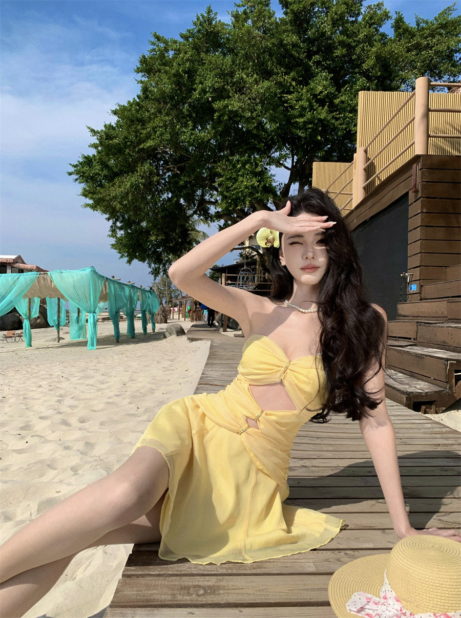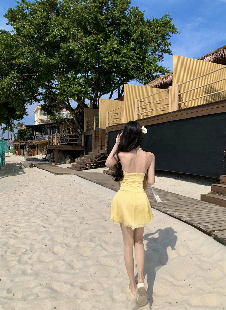 Dreamy A-Line Strapless Mini Skirt Vibrant Yellow Cutout Flowy Tulle Short Dress AP3445