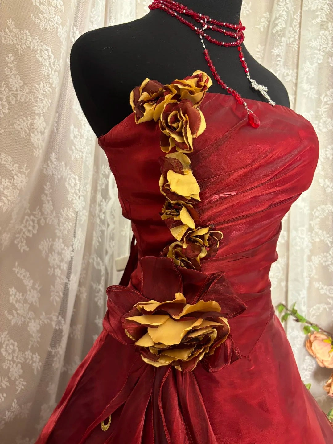 Playful A-Line Strapless Sweet 16th Gowns Handmade Flowers Red Prom Dress AP2908