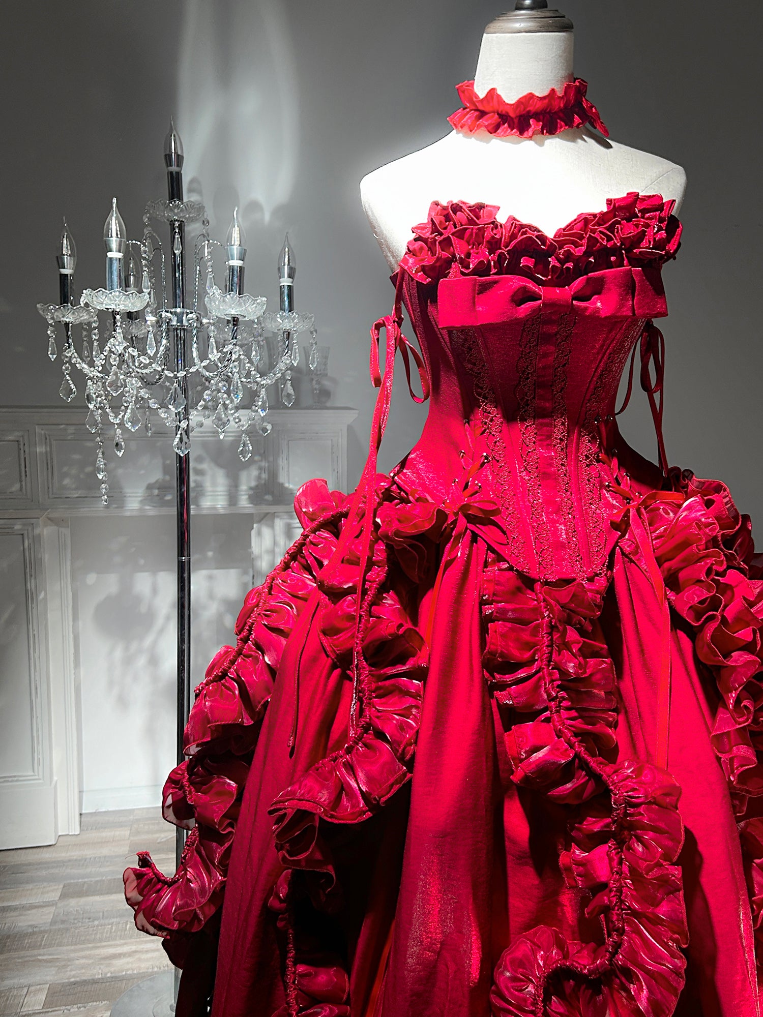 Adorable A-Line Strapless Red Sweet 16th Gowns Handmade Flowers Sequins Ruffled Prom Dress AP3275