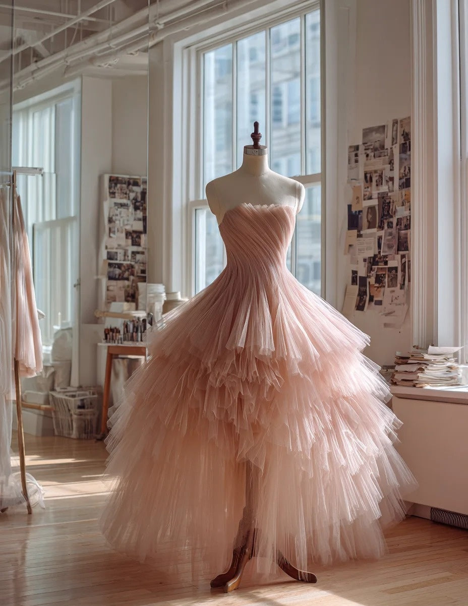 Enticing A-Line Strapless Sweet 16th Gowns Pink Tiered Tulle Prom Dress AP4287