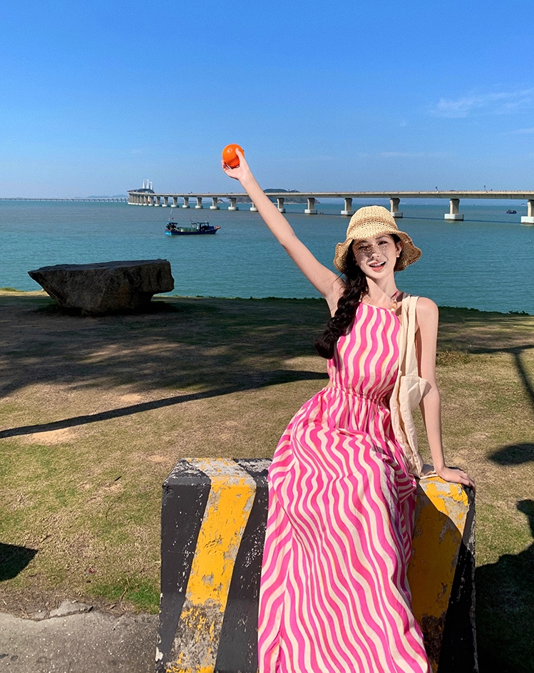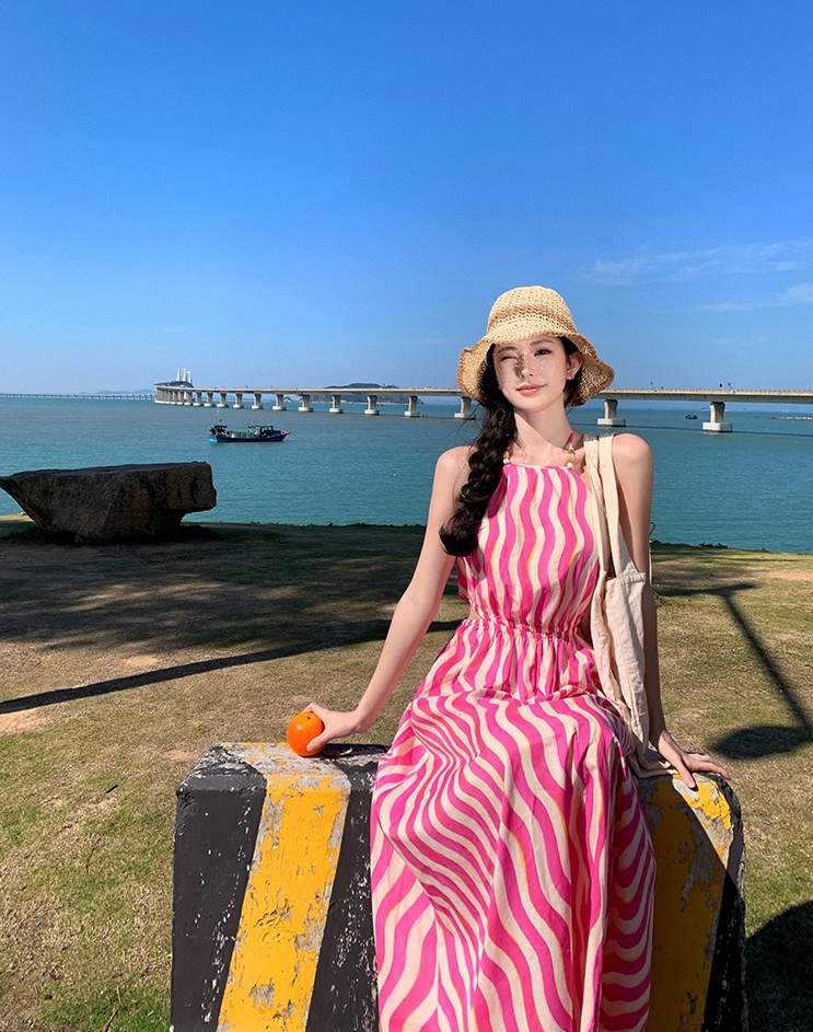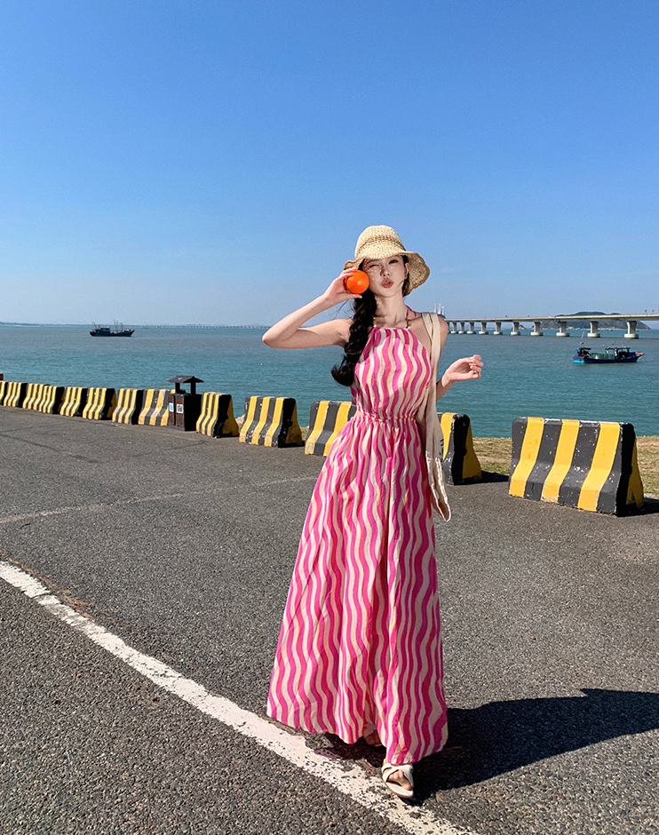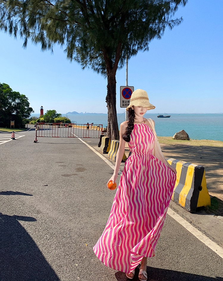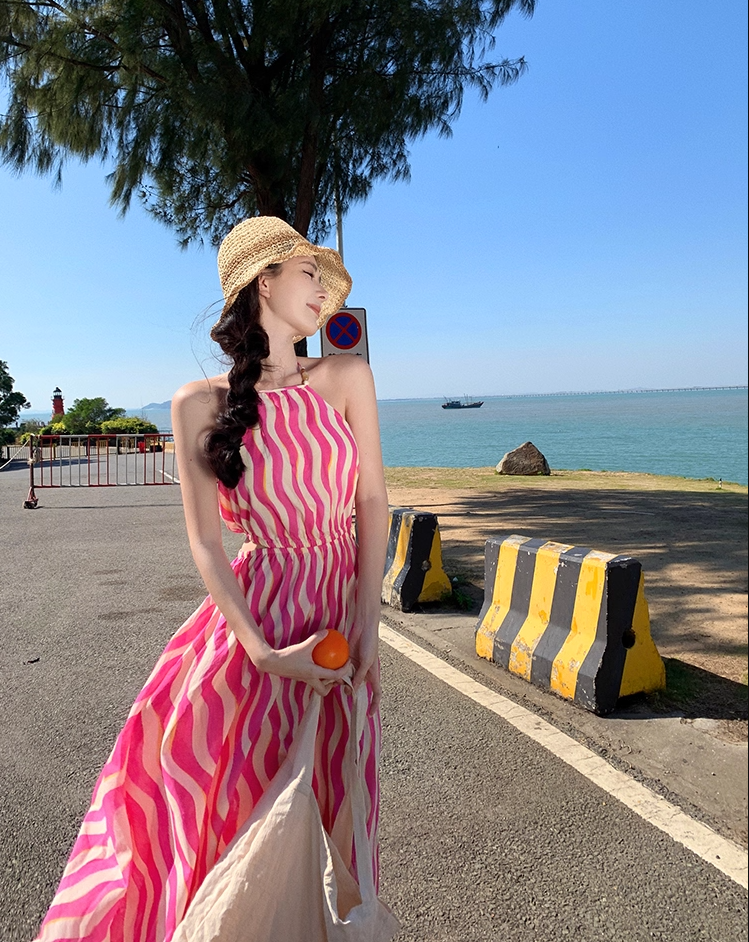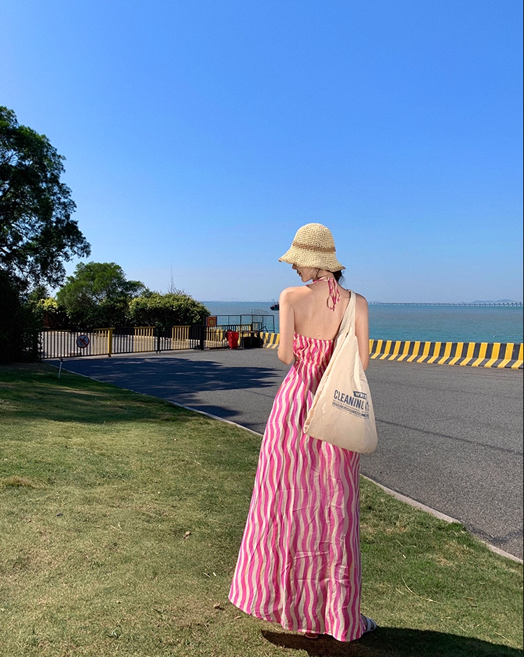 Boho-Inspired A-Line Cinched-Waist Maxi Dress Sweet Cutout Backless Stripes Print Halter Long Dress AP3472