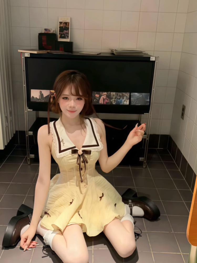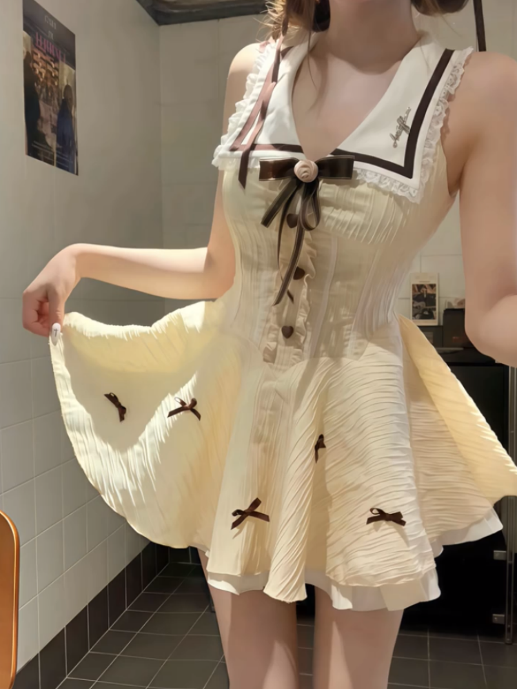 Dopamine Style A-Line V Neck Mini Skirt Cute Bows Lace Trim Cinched-Waist Short Dress AP4046
