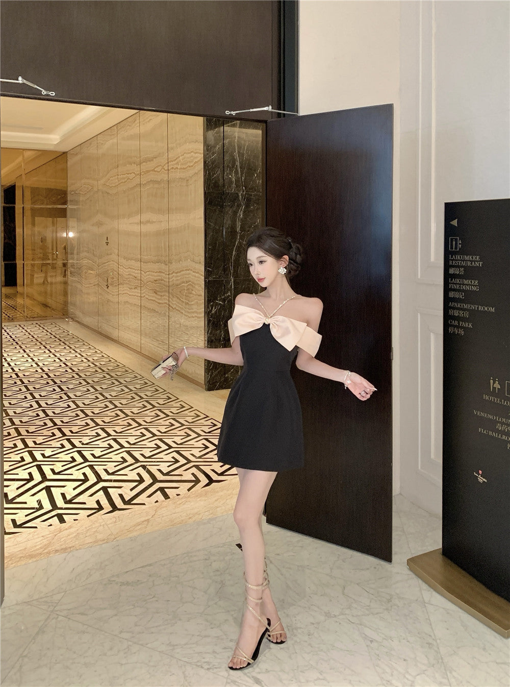 Vogue Large Contrast Bow Rhinestone Straps Mini Skirt Sexy Evening Galas Off-Shoulder Sheath Short Dress AP1997