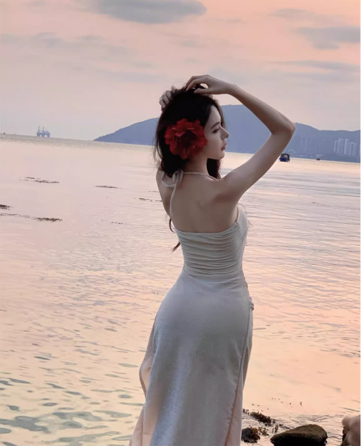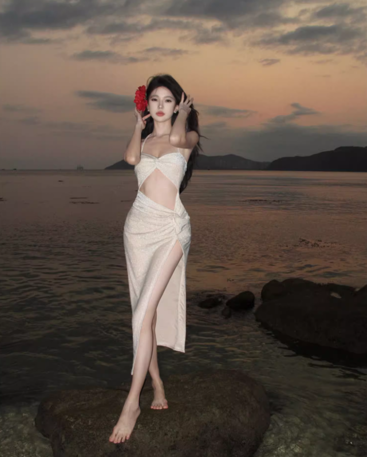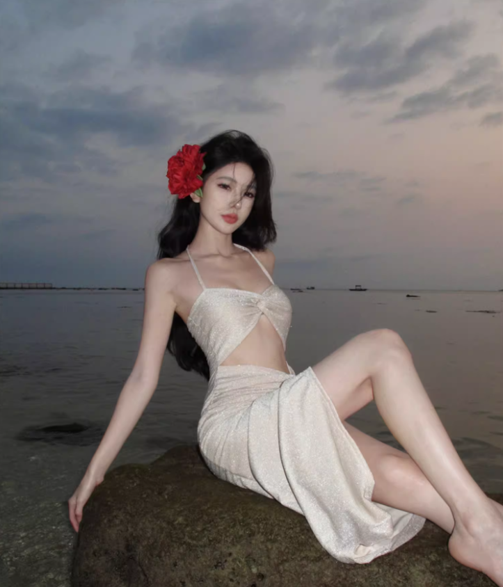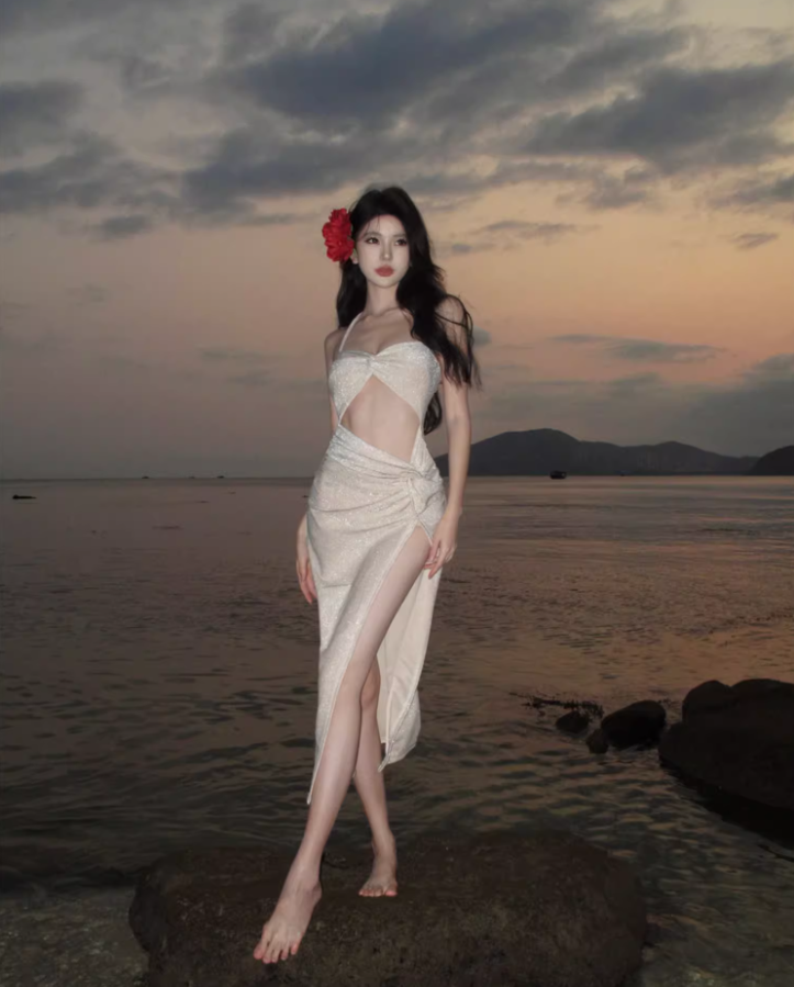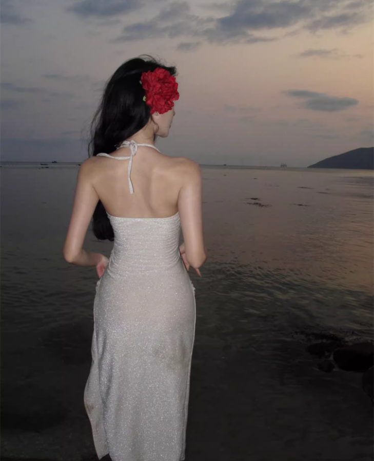 Alluring Glitter Sequins Open-Waist Midi Dress Chic Bodycon Backless Mermaid High-Slit Halter Long Dress AP1413