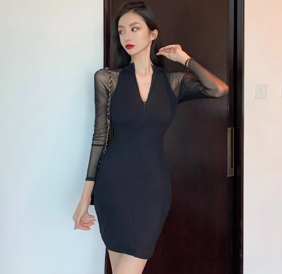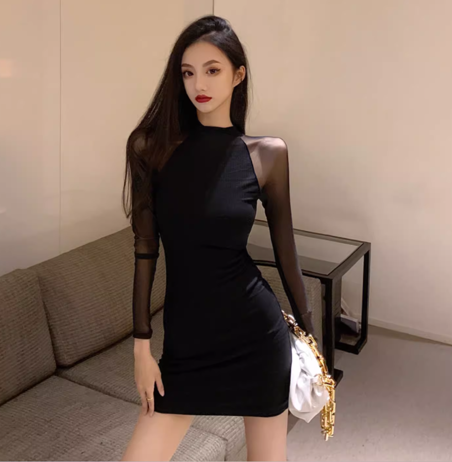 Sexy Black Long Mesh-Sleeve Bodycon Mini Skirt Hot Girls Nightclubs Round Neck Sheath Short Dress AP1837