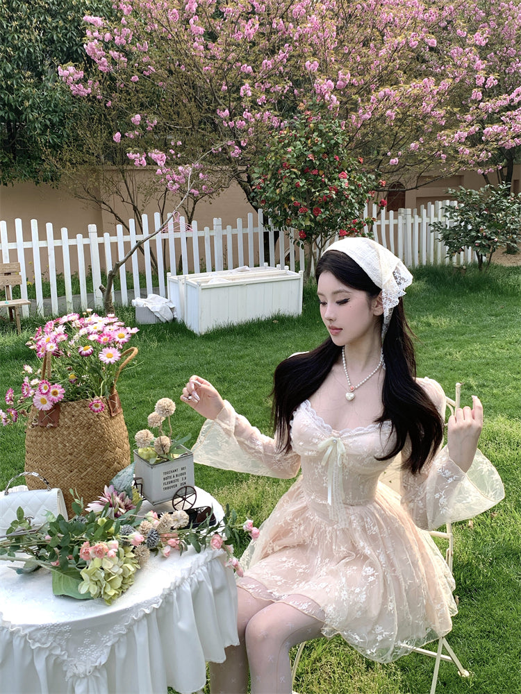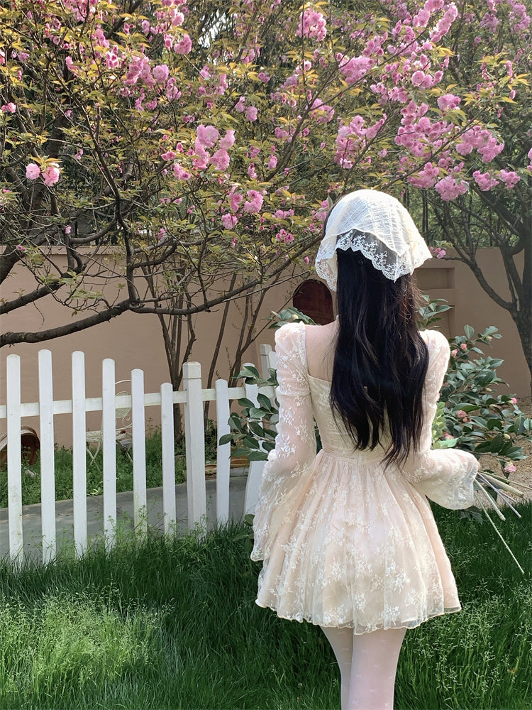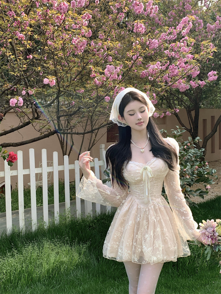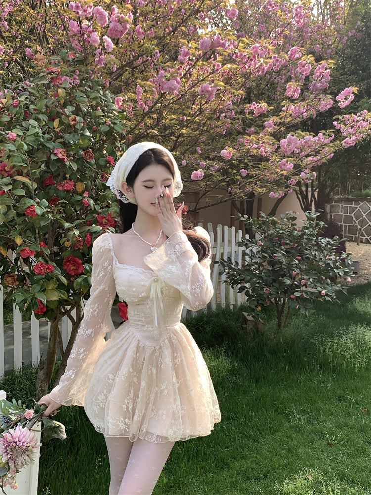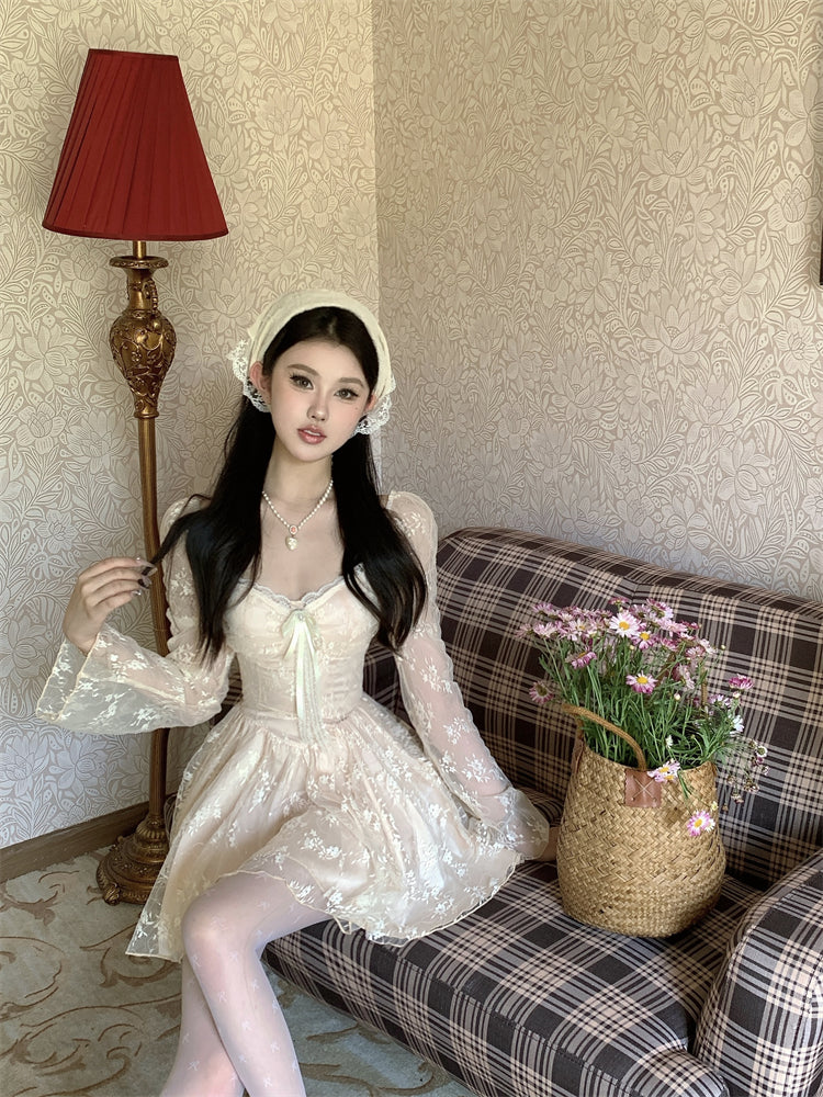 Exquisite Cream White Mesh Long Sleeve Sheath Mini Skirt Fairy-Inspired Textured Floral Print Lace Trimmed Tulle Overlay Short Dress AP1827