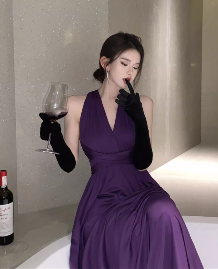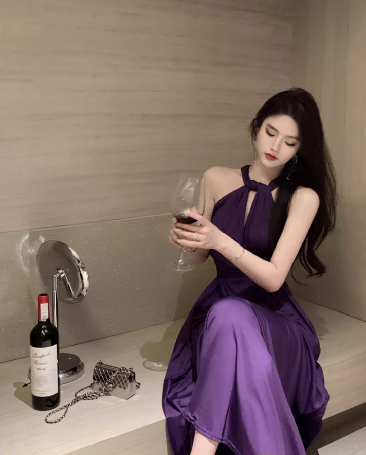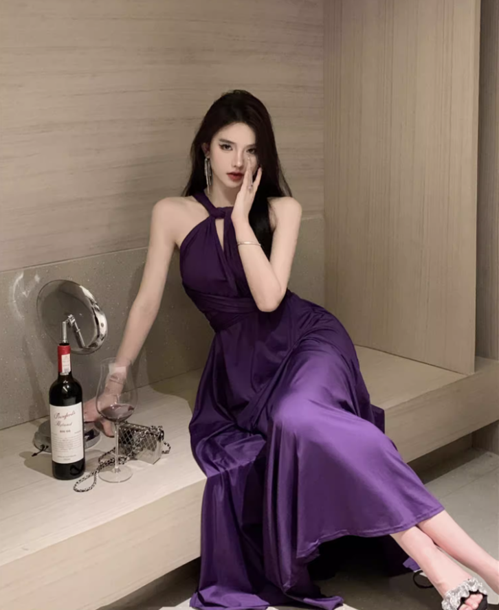 Sexy Purple Draped Hollow-Out Maxi Dress Chic CinChed-Waist Tie-Back Halter Long Dress AP1414