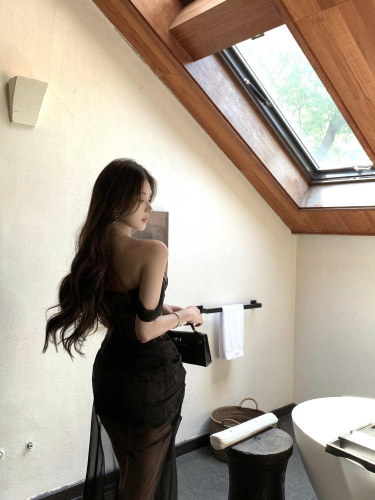 Glamorous Black Off-Shoulder Lace Trimmed Maxi Skirt Sexy Draped Sheer Mesh Overlay High Slit Long Dress AP2067