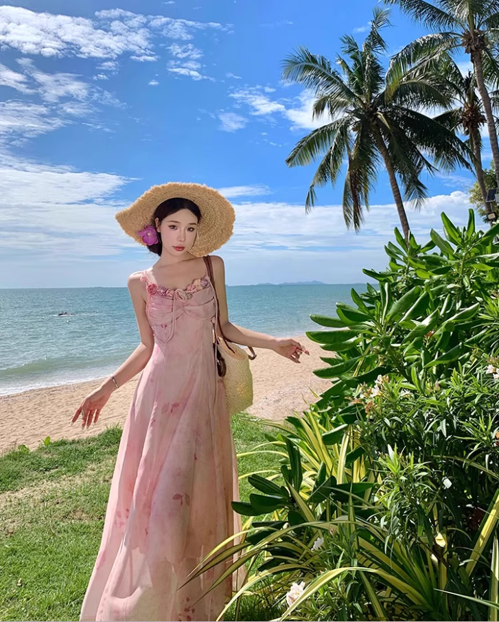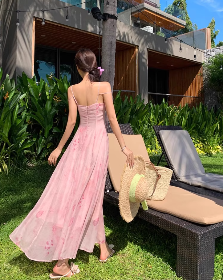 Gorgeous Pink Flowers Design Spaghetti Strap Maxi Dress Versatile Summer Getaways Floral Print Double Layers Long Dress AP1528