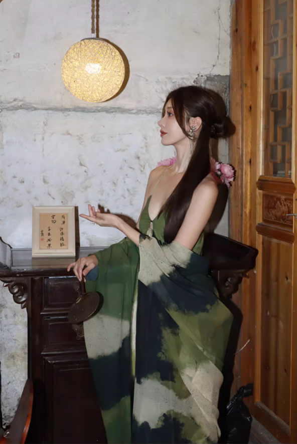 Vogue Ink Wash Gradient Bamboo-Green Maxi Dress With Stole Vintage Spaghetti Strap East Elegance Long Dress AP1479