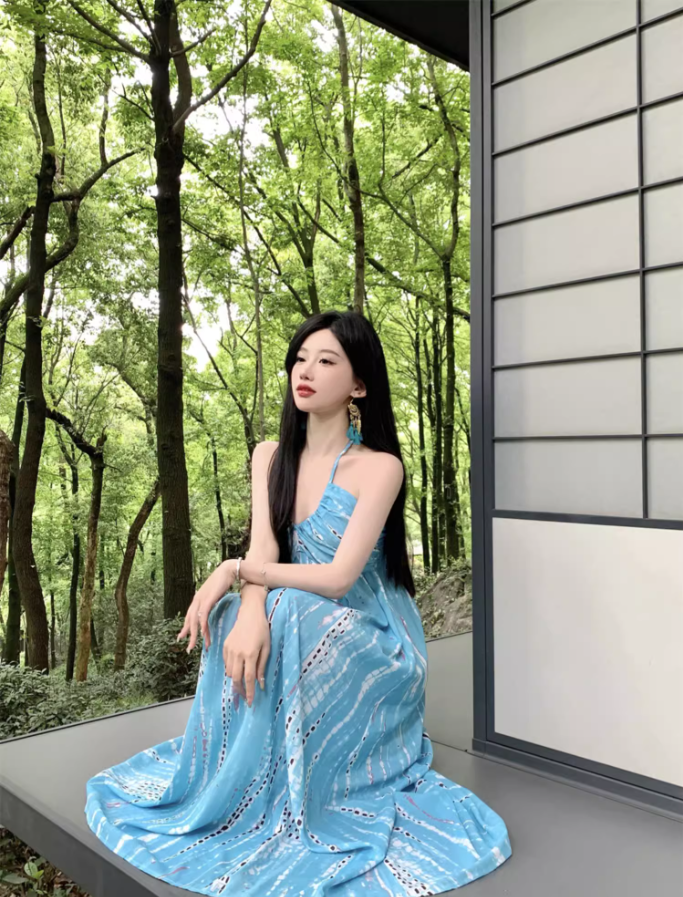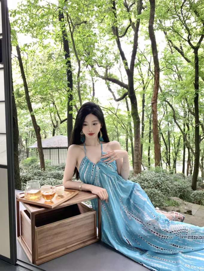 Romantic Blue Tie-Dye Hollow-Out Maxi Dress Versatile Backless Coastal Trips Tie-Strap Halter Long Dress AP1448