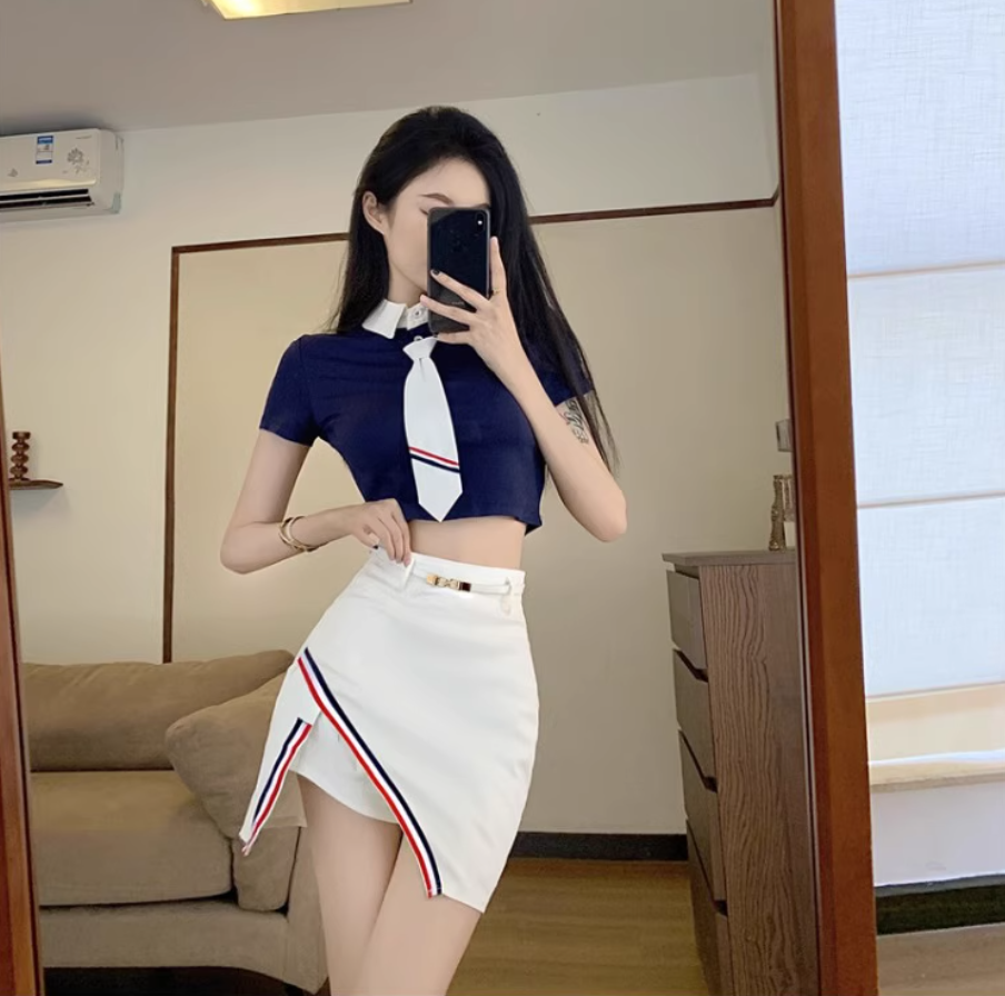 Chic Preppy Co-ord Set Navy Crop Top White Mini Skirt Vibrant Striped Tie Cutout Short Dress AP1705