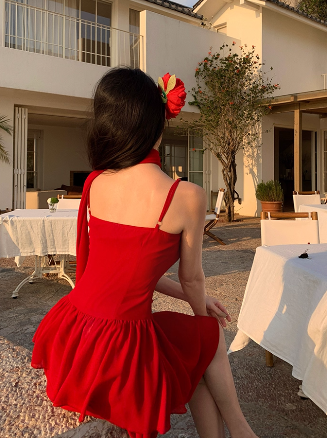 Sexy Flower Ornament Red A-Line Short Skirt Sweet Girls Tiered Ruffles Hem Short Dress AP1306