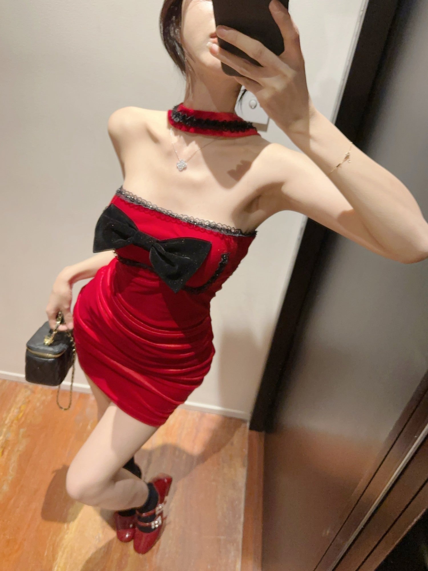 Fabulous Bodycon Red Velvet Mini Skirt Fancy Cinched-Waist Lace Trim Bow Halter Short Dress AP3817