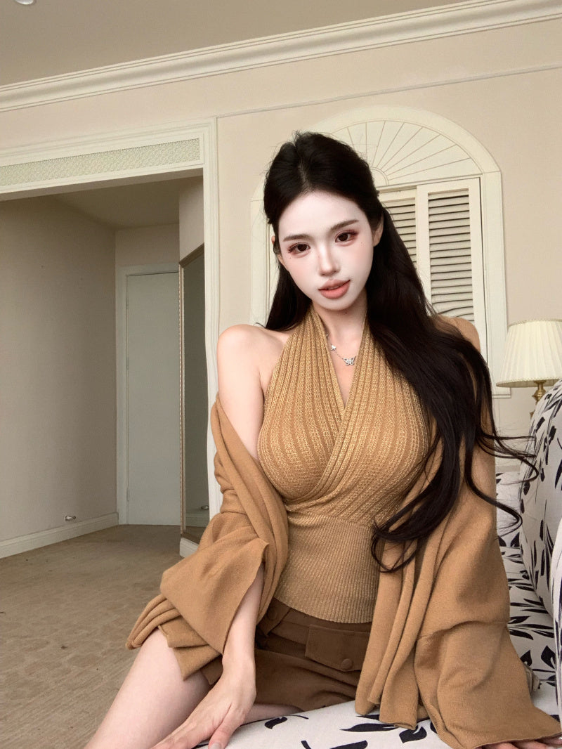 Chic Bodycon Ribbed Cinched-Waist Mini Skirt Vintage 2-Piece Set Halter Short Dress AP3818