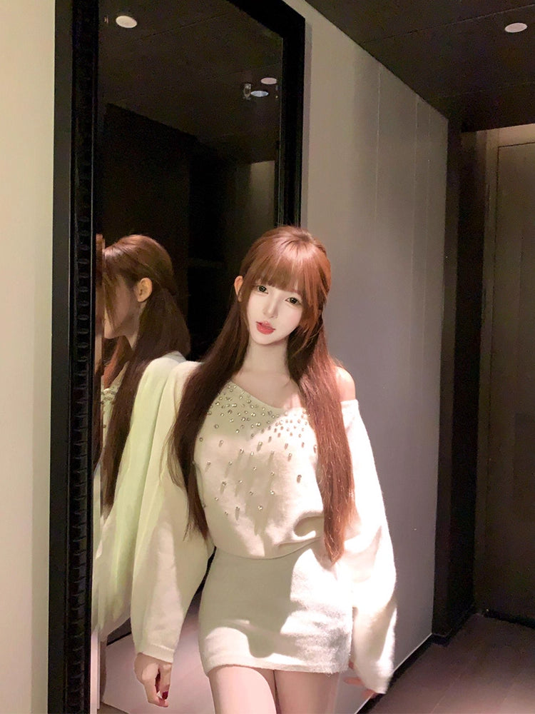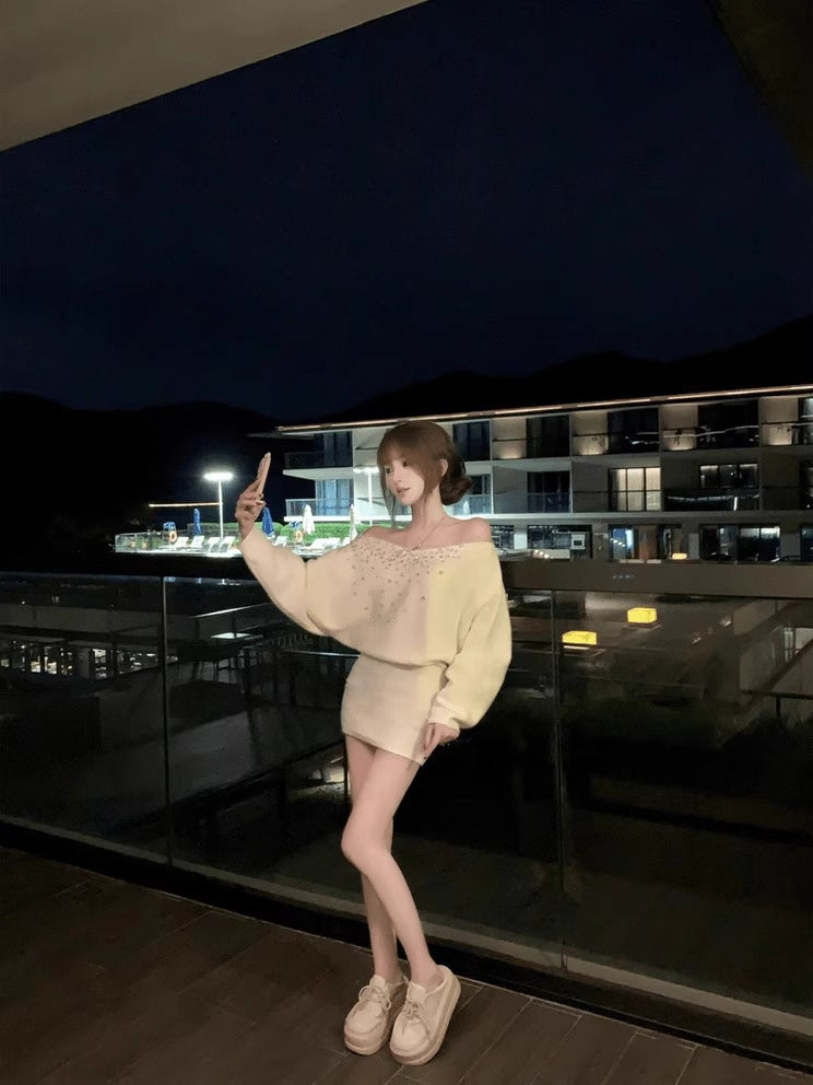 Fancy Off Shoulder Sweater 2-Piece Set Bodycon Mini Skirt Trendy Long Sleeve Beaded Short Dress AP3792