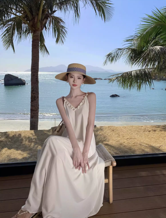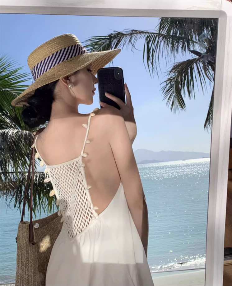 Stunning Crochet-Back Maxi Dress Vogue Spaghetti Strap V-Neck Loose Style Long Dress AP1271