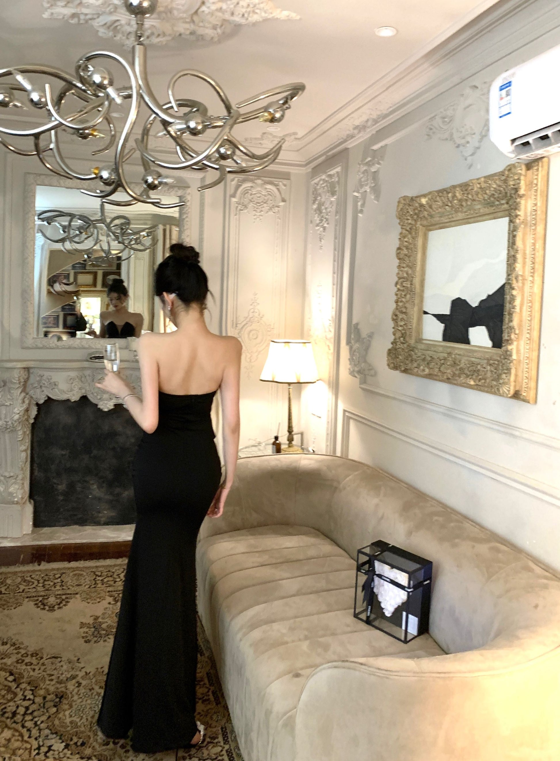 Charming Strapless High-Slit Cinched-Waist Maxi Skirt Sexy Vacation Outfit Sheath Backless Black Mesh Splicing Long Dress AP1700
