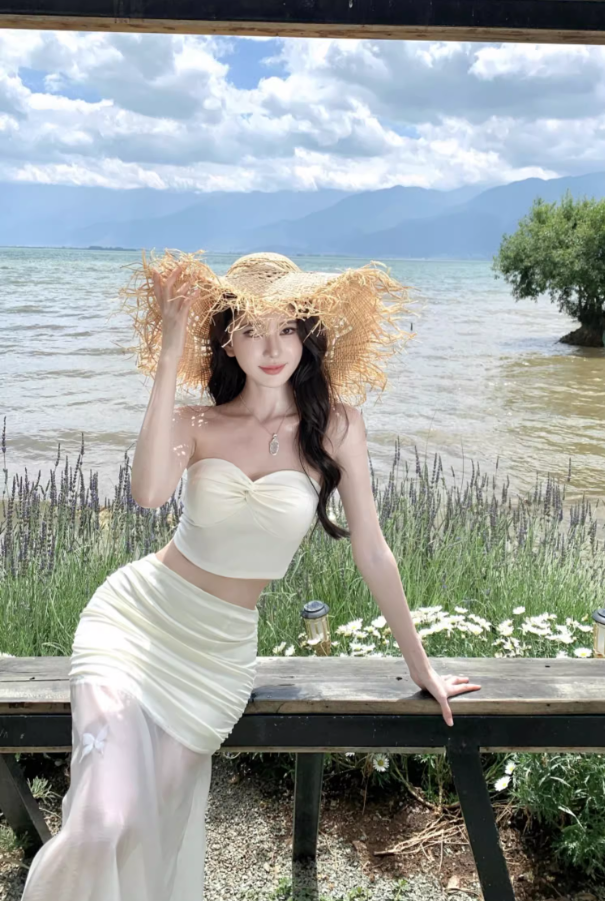 Dreamy Sheath Two-Piece Set Maxi Dress Summer Trips Outfit Strapless Top Tulle Splicing Long Dress AP1291