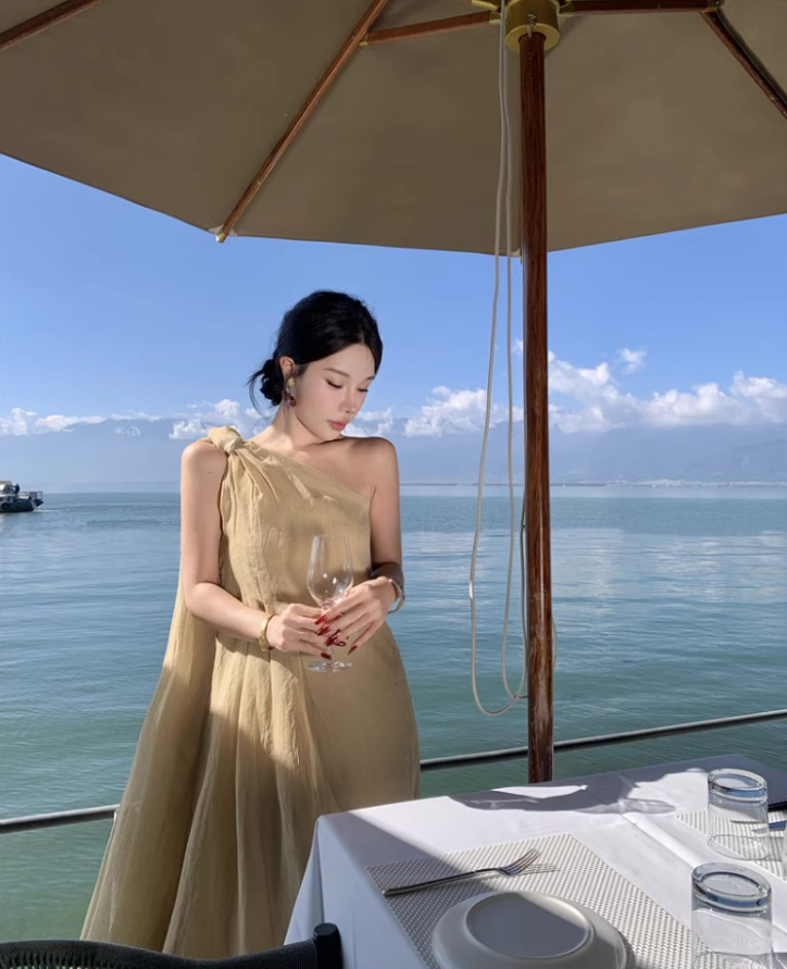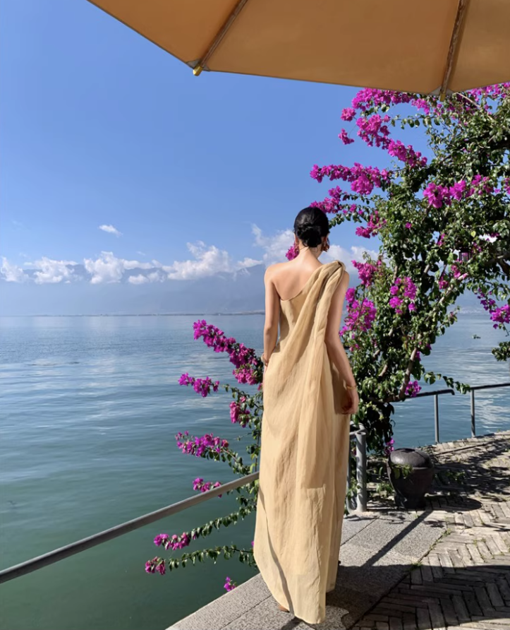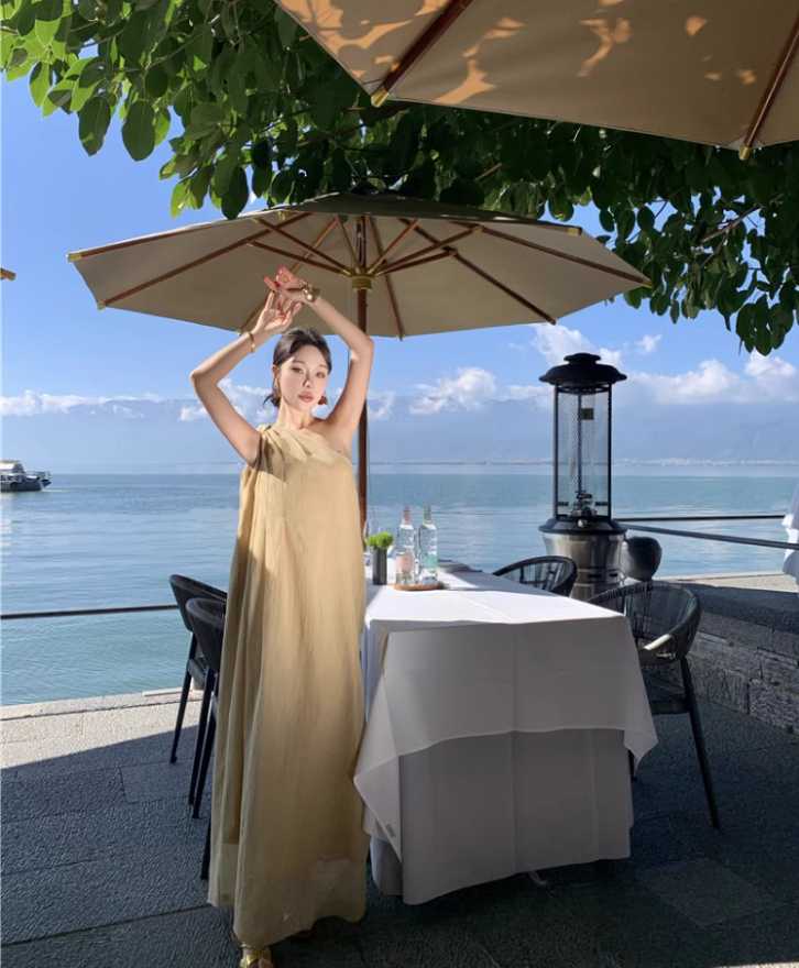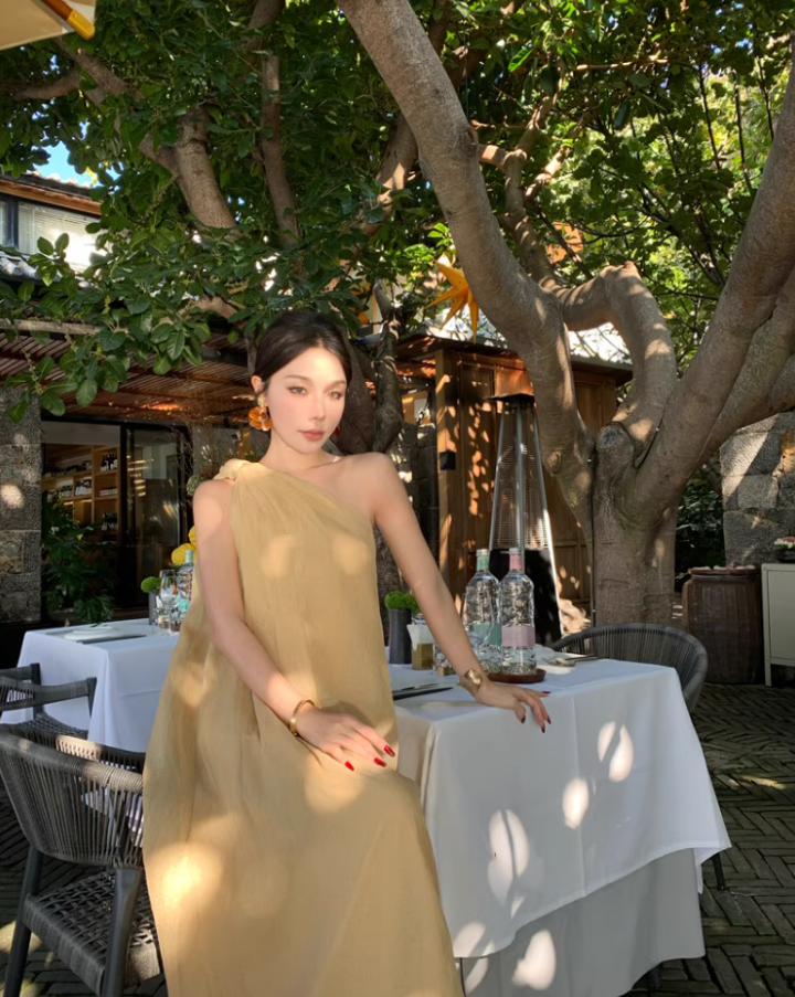 Gorgeous Asymmetric Neckline One Shoulder Maxi Dress Graceful Flowy Soft Fabric Long Dress AP1371