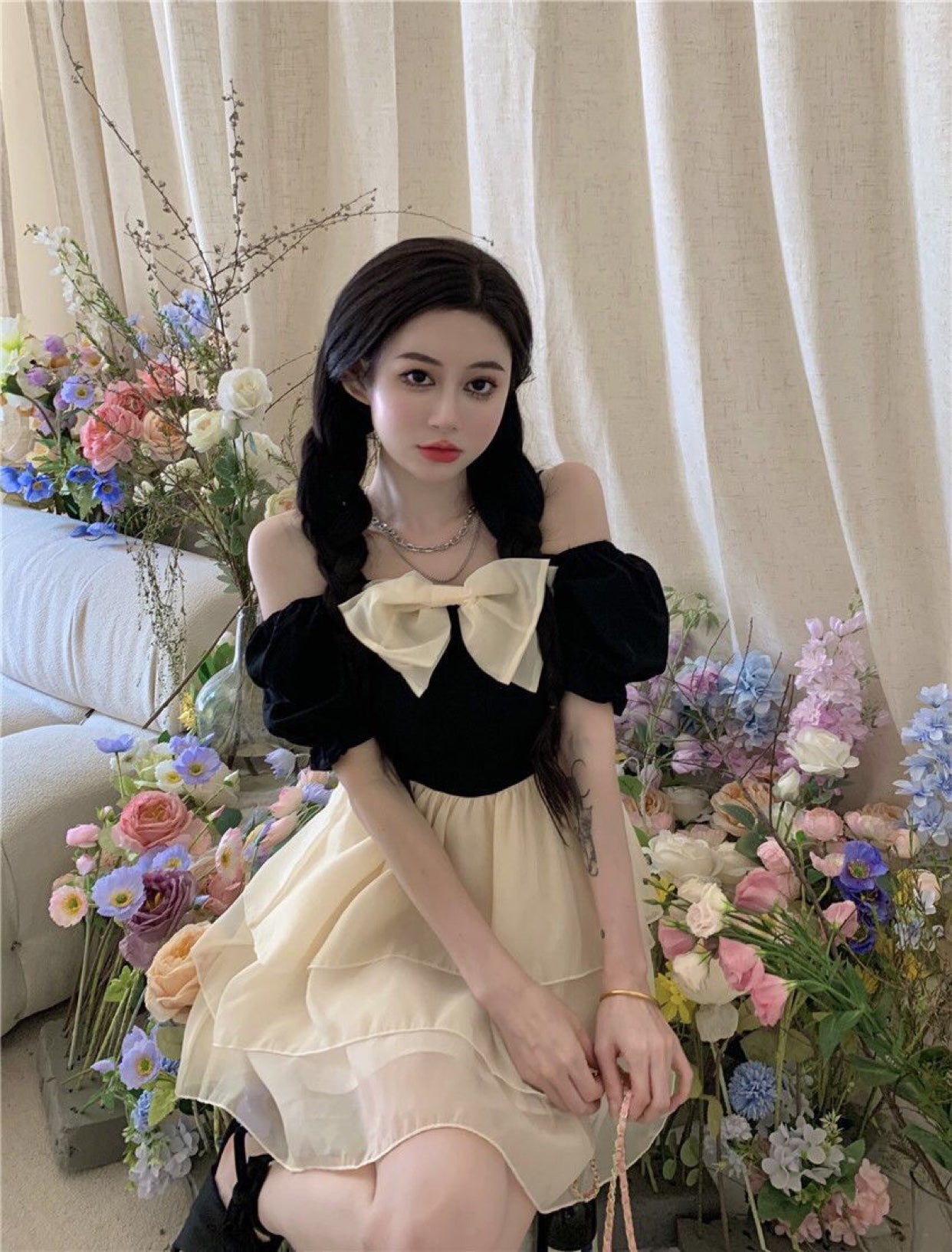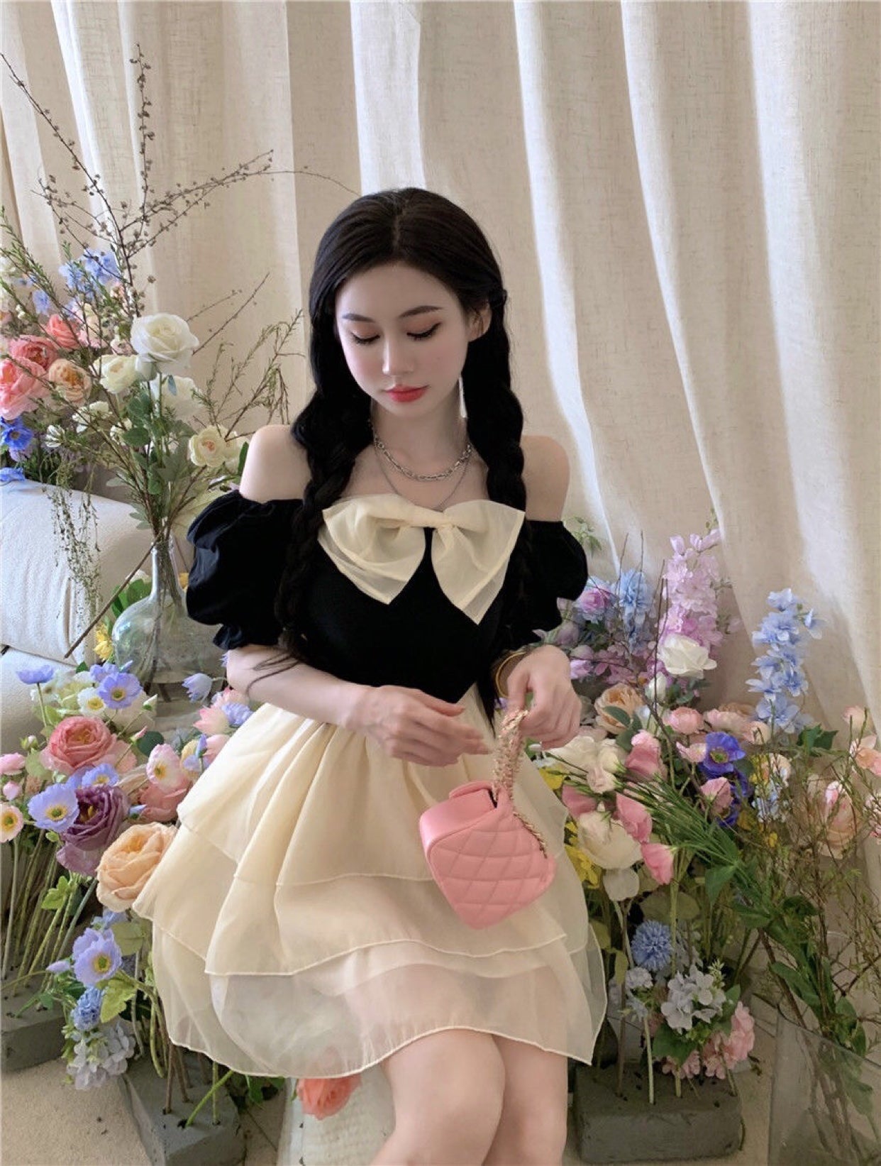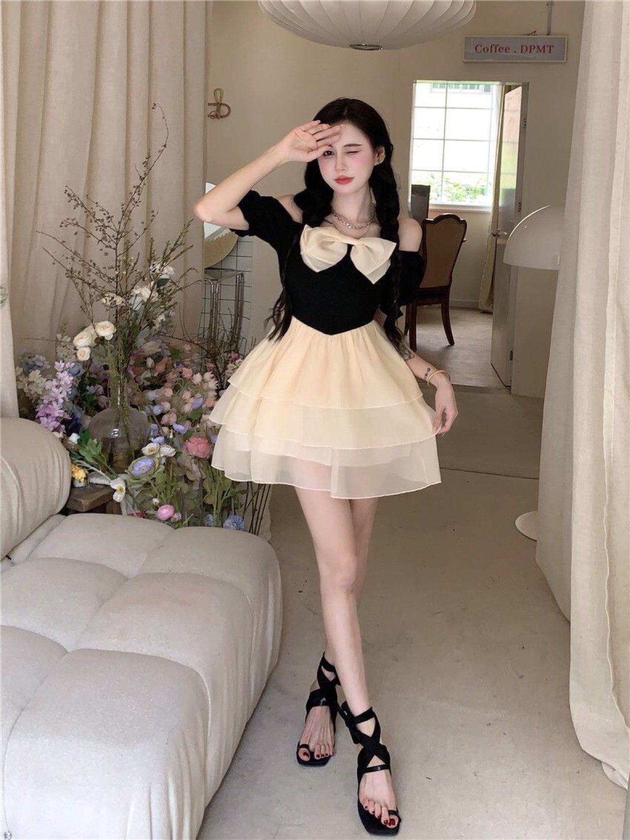 White-Black Splicing Tulle Layered Summer Skirt Short Sleeve Ball Gown Short Dress AP0458