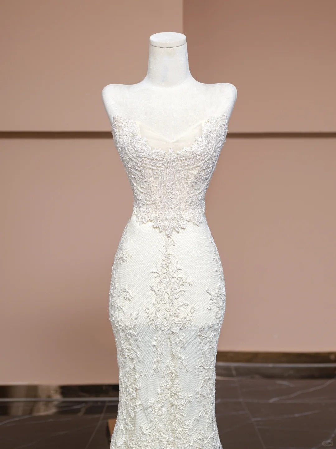 Graceful Strapless Mermaid Bridal Gowns Lace Tulle Wedding Dress AP2296
