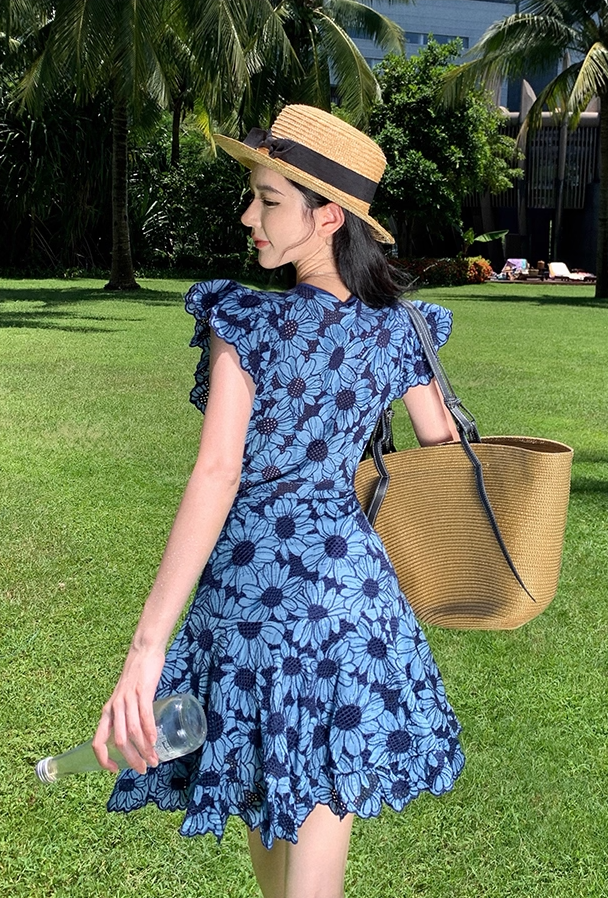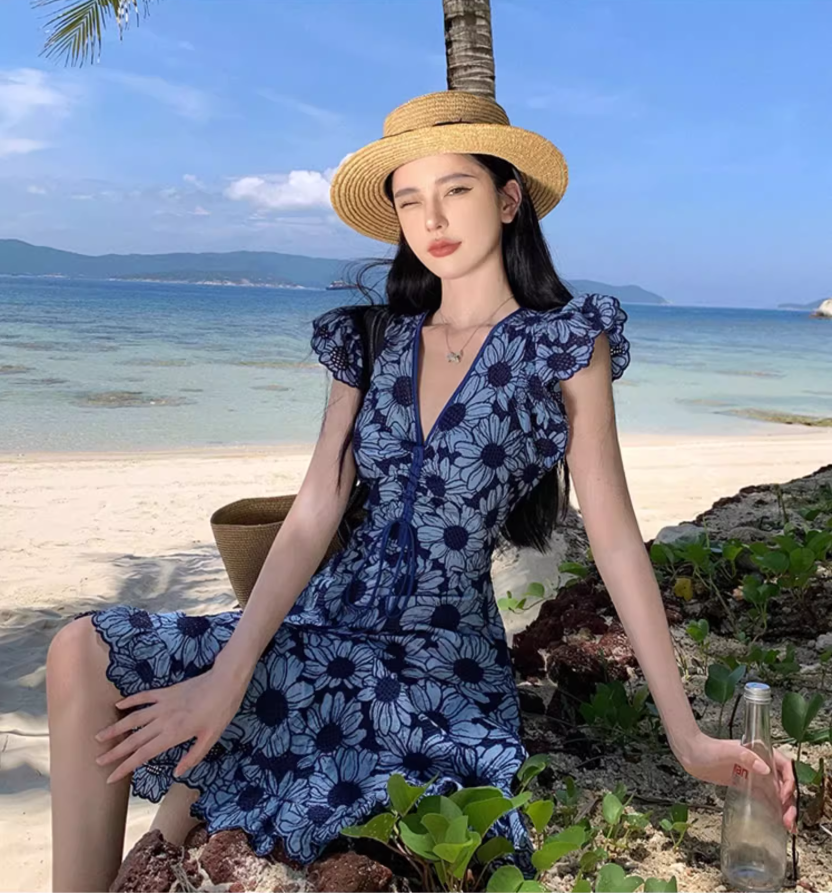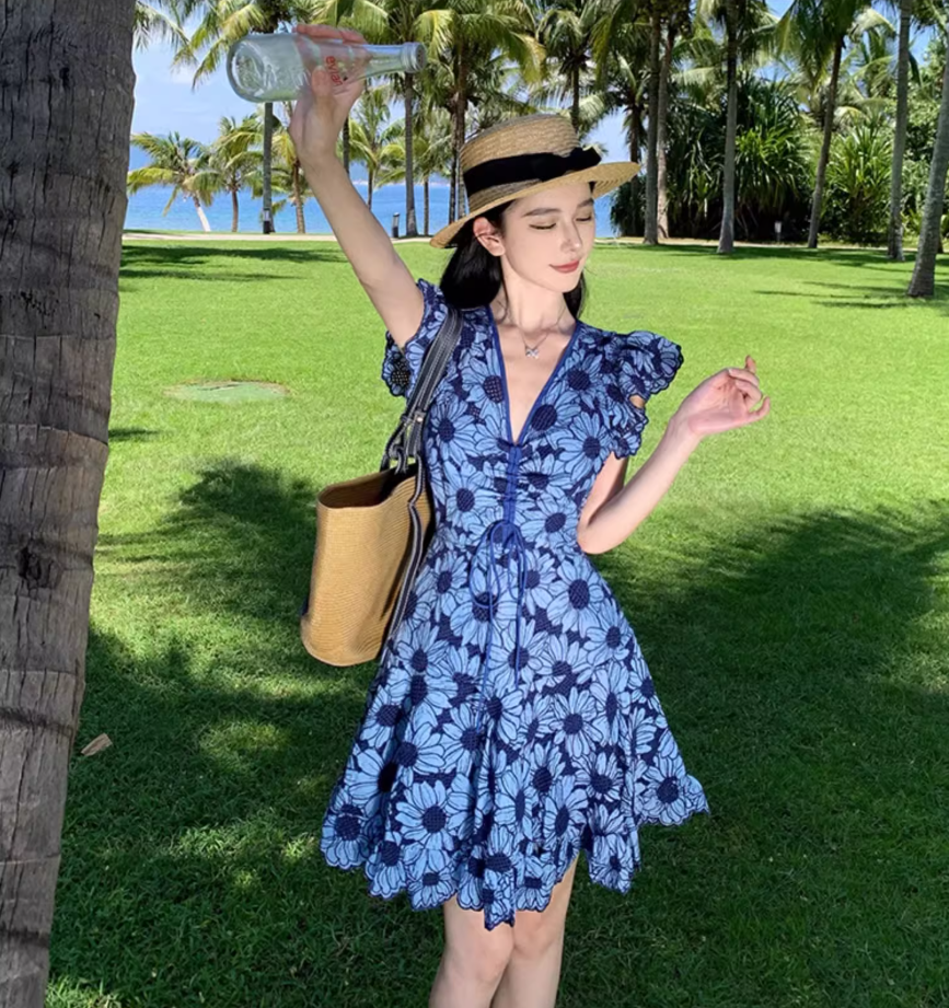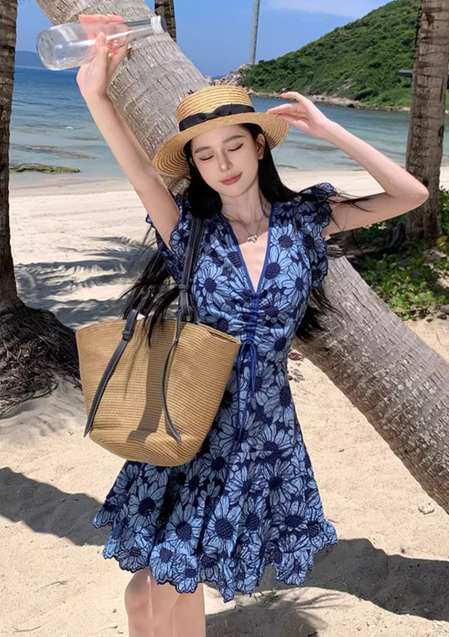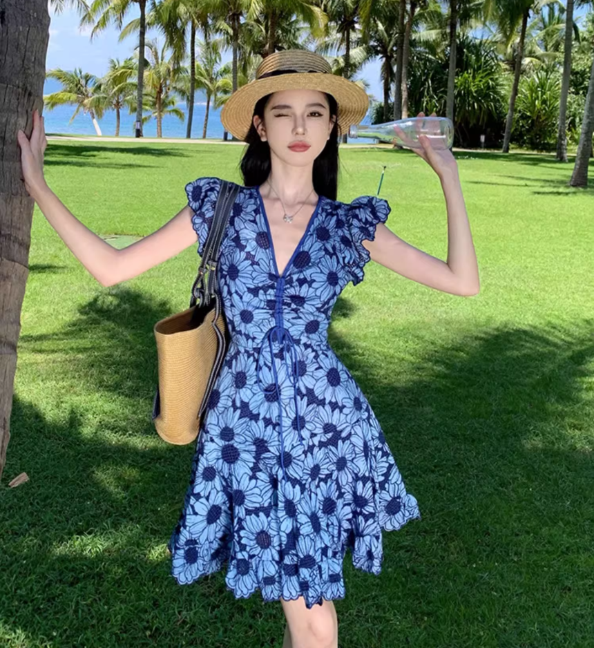 Floral Hem Design Soft Fabric Short Skirt Alluring V-Neck Fitting A-Line Short Dress AP0692