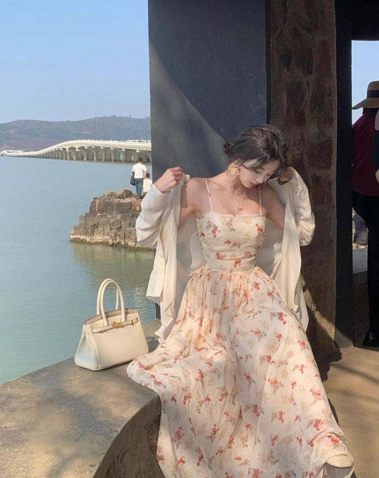 French Style Flowy Hem Maxi Dress Beach Getaways Spaghetti Strap A-Line Long Dress AP1158